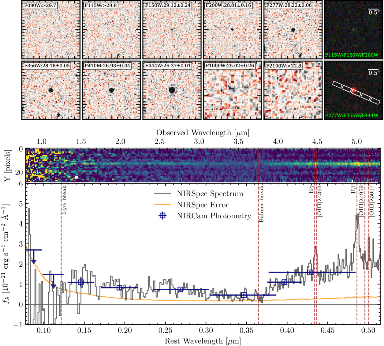 Figure 1. Top: 5″ × 5″ NIRCam and MIRI cutouts of CAPERS-LRD-z9 in the PRIMER-COSMOS NIRCam and COSMOS-3D MIRI images. We also show RGB images generated for both the short-wavelength and long-wavelength NIRCam detectors. We overplot the NIRSpec MSA slitlet. Bottom: we plot the 2D and 1D photometrically calibrated spectra of CAPERS-LRD-z9 in fλ. We mark strongly detected emission features with red dashed lines and overplot the NIRCam photometry with blue squares. Despite being near the corner of the central shutter in the slitlet, CAPERS-LRD-z9 exhibits a detectable Lyα break, a strong Balmer break, and clear rest-optical emission line detections, including broadened Hβ and Hγ and narrow [O iii] λλ4959, 5007. The combination of narrow forbidden lines and a broad Hβ clearly indicates that CAPERS-LRD-z9 is a BLAGN at z = 9.288.