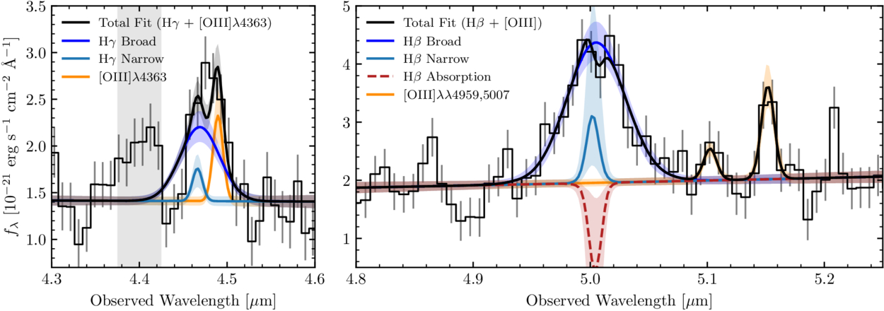 The spectrum of our object presented in Figure 1 coupled with our initial msaexp fit hints at the presence of broad components in both Hγ and Hβ emission lines, in contrast to the narrower profiles of the adjacent [O iii] λλ4959, 5007 Å doublet. Further, the Hβ line appears to be double-peaked, which hints at an underlying absorption component. To evaluate the potential significance of these features, we perform a more detailed line fitting to the Hγ + [O iii] λ4363 and Hβ + [O iii] λλ4959, 5007 line complexes. The redder end of PRISM, where Hβ + [O iii] λλ4959, 5007 is located, has a higher spectral resolution, and this line complex is not blended; therefore, we fit that region first. We assume that the lines in the [O iii] doublet are both narrow, while the Hβ consists of a narrow, a broad, and an absorption component. In our fitting, we assume that the velocity width of the narrow component for all three lines is the same, and we fix the ratio [O iii] λ5007/[O iii] λ4959 = 2.98 (P. J. Storey & C. J. Zeippen 2000). Velocities of the narrow, broad, and absorption components are allowed to vary between 50 and 800, 1000 and 5000, and 50 and 1000 km s−1, respectively. We fix the redshift (and thus the line centers of the narrow lines using the vacuum wavelengths from P. A. M. van Hoof 2018); however, we allow for small (∼±500 km s−1) offsets in the absorption component and broad component of Hβ (relative to the narrow [O iii]) to allow for kinematic motion of the gas. We model the local continuum with a first-order polynomial.