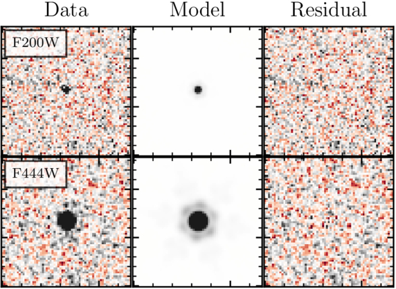 Figure 3. Results of 2D surface brightness profile fitting. We show 2″ × 2″ cutouts in F200W and F444W around CAPERS-LRD-z9 in the left column. Our best-fit point-source models in each band are shown in the middle column, while the residuals (data-model) are shown in the rightmost column. CAPERS-LRD-z9 is unresolved in all bands, with