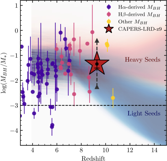 Standard image High-resolution imageThe observed value of CAPERS-LRD-z9 is broadly consistent with both scenarios, but the lower limit nature of this value may hint toward the heavy-seed regime. We discuss possible explanations for this effect and its possible interplay with black hole seeding and growth in Section 5.1.
