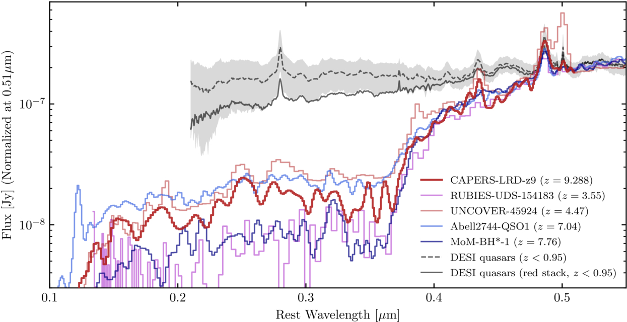 Figure 7. The NIRSpec MSA/PRISM spectra of CAPERS-LRD-z9, MoM-BH*-1 at z = 7.76 (R. P. Naidu et al. 2025), RUBIES-UDS-154183 at z = 3.55 (A. de Graaff et al. 2025), UNCOVER-45924 at z = 4.47 (I. Labbe et al. 2024), and A2744-QSO1 at z = 7.04 (L. J. Furtak et al. 2024; X. Ji et al. 2025) normalized to the spectrum of CAPERS-LRD-z9 at rest-frame 0.51 μm. We apply a 1–2 pixel Gaussian smoothing (smoothing lower-z objects less, as they are already relatively smoothed by PRISM’s lower spectral resolution at bluer observed wavelengths) to all five spectra to increase visual clarity. For comparison, we plot the median and 10th–90th percentile of DESI spectra of 232 quasars (z < 0.95) selected to have similar values of Hβbroad FWHM, L([O iii] λ5007), and [O iii] λ5007/Hβ flux ratio (gray shading and gray dashed curve) and the stack of the reddest 20 DESI quasars (gray solid curve). While the rest-optical emission from CAPERS-LRD-z9 strongly resembles that of the other NIRSpec sources, these sources are all starkly different from quasars identified in DESI, where even the reddest DESI quasars fail to approach the reddening or Balmer break exhibited in the NIRSpec LRDs.