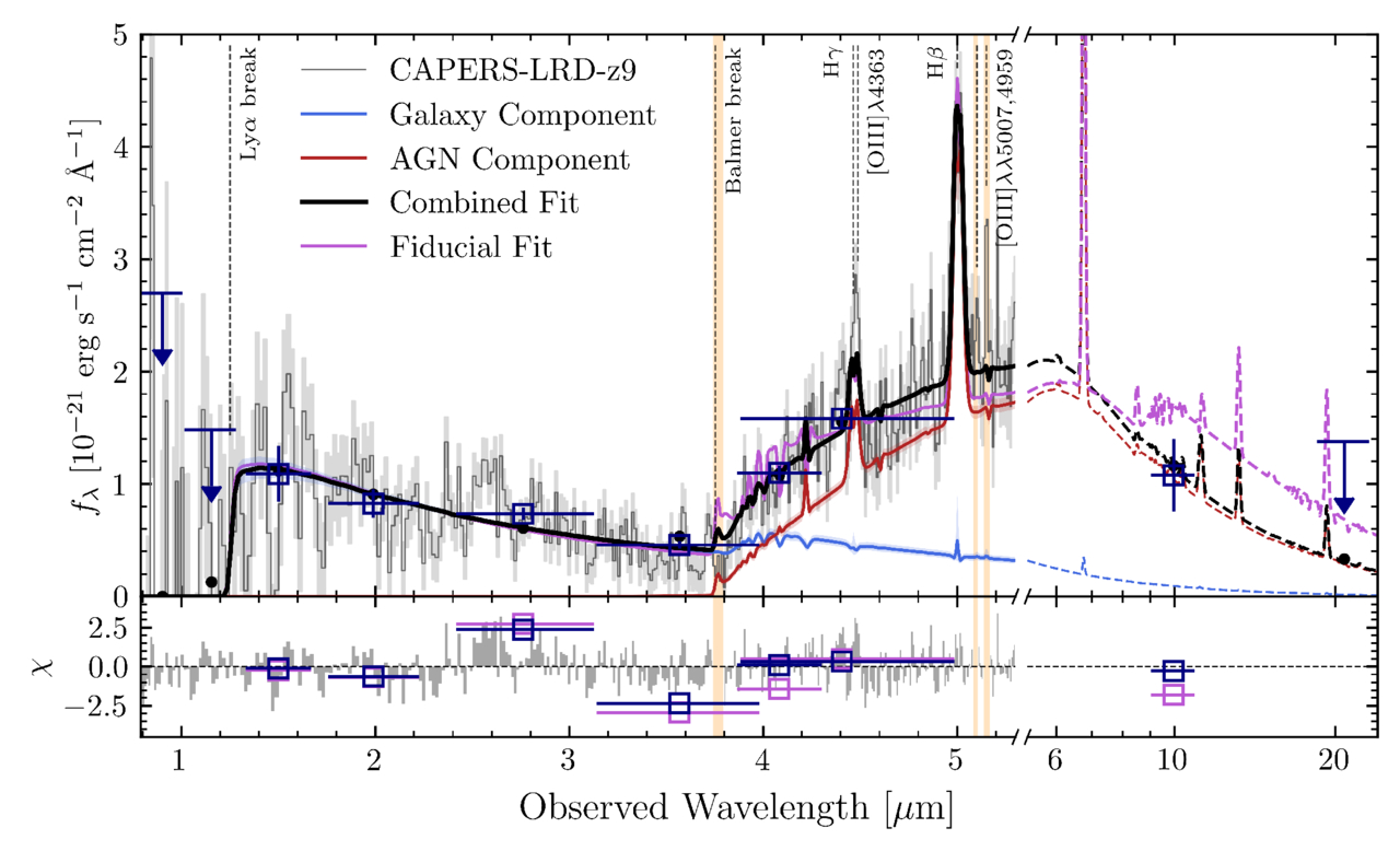 Figure 8. Spectrum and 1σ errors of CAPERS-LRD-z9 (gray curve, light gray shading), the best-fit host galaxy component (solid and dashed blue curves), the best-fit dense-gas-enshrouded AGN component (solid and dashed red curves), combined host+AGN fit (solid and dashed black curves), fiducial SMC dust law fit (solid and dashed purple curves), photometry data (dark blue squares and upper limits), best-fit model photometry (black points) in the upper panel, and masked regions (gold shading). The lower panel shows the χ residuals of the fit for the spectrum (gray curve) and photometry (dark blue squares). Note that the flexible (yet unphysically steep) AGN dust law allows for strong agreement with the MIRI F1000W flux that cannot be reproduced by an SMC law.