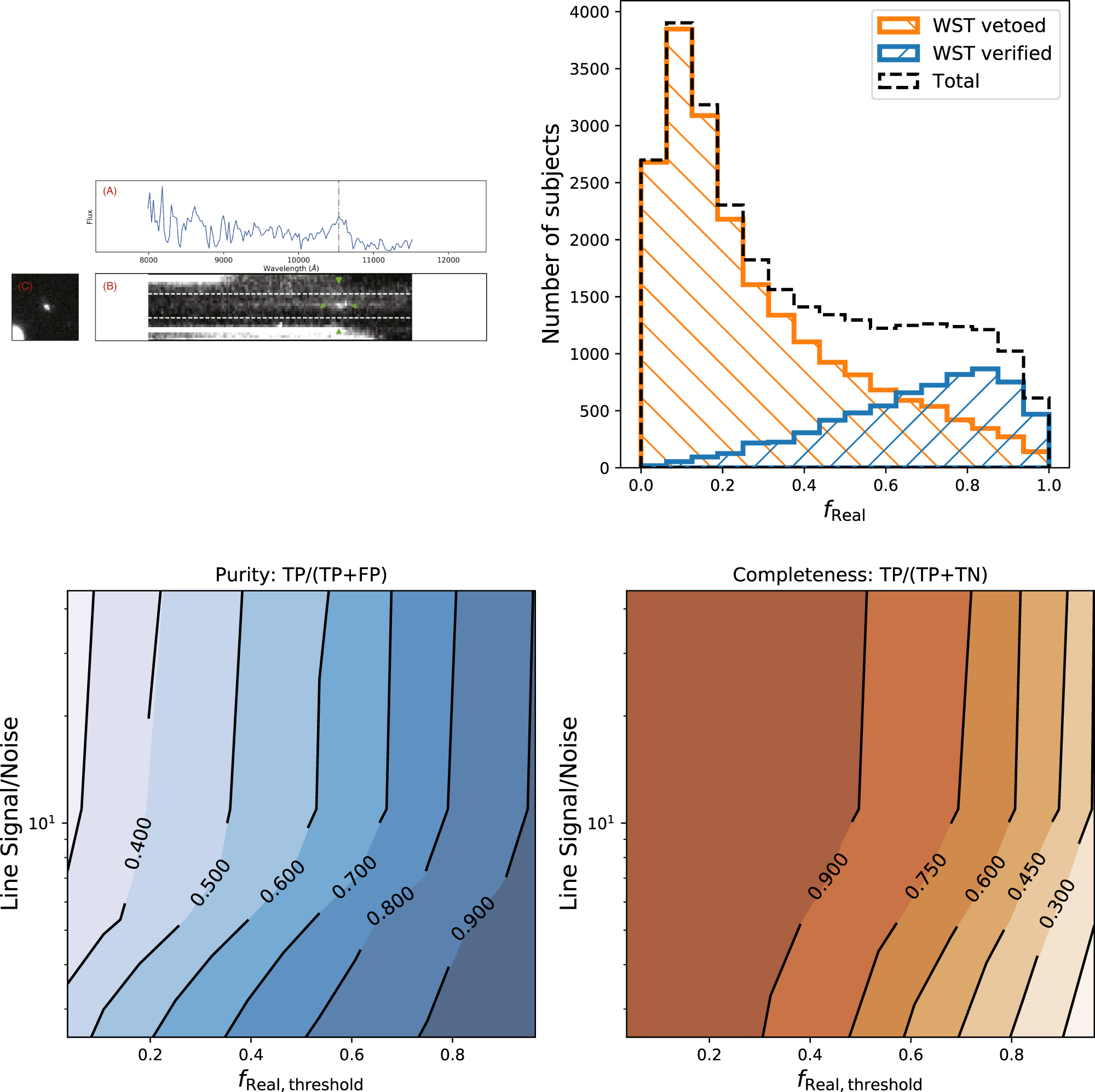 Figure 1. Top: typical fixed-format subject image used by volunteers to classify putative emission lines as real or spurious. Lower left: the distribution of fReal,threshold for the full sample (black, dashed), the sub-sample of WSST-verified lines (blue) and the sub-sample of WSST-vetoed lines (orange). Sample purity (PS = TP/(TP + FP), lower center) and completeness (CS = TP/(TP + TN), lower right) realized using volunteer classifications as a function of threshold subject vote fraction fReal,threshold and line signal-to-noise ratio.