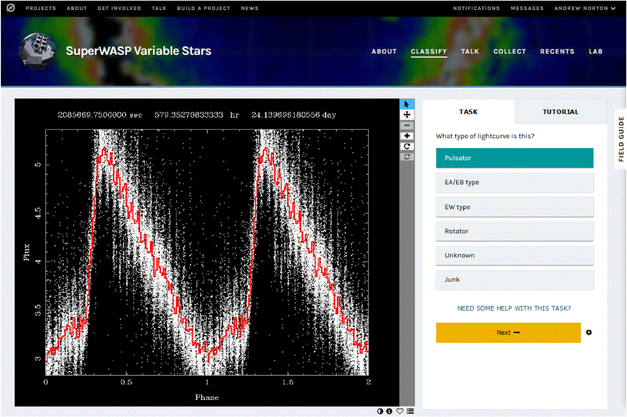 Standard image High-resolution imageBecause Zooniverse projects are open to everyone, the classification tasks must be straight-forward and not depend upon subject-specific knowledge. Consequently we have devised a simplified scheme to classify SuperWASP folded lightcurves. When users visit the project at:https://www.zooniverse.org/projects/ajnorton/superwasp-variable-stars they are presented with a tutorial that guides them through the classification process; a field-guide is also available which presents samples of lightcurves of each type. The classification task asks users whether each folded lightcurve resembles that of an EA or EB type eclipsing binary; an EW type eclipsing binary; a pulsating star; or a generic rotational modulation. Options for unknown variable types or "junk" are also available. In the case of eclipsing binary lightcurves, often the period at which the data are folded will be half the genuine period. Furthermore, in both eclipsing systems and pulsating systems, sometimes the identified period is clearly incorrect. Consequently, a subsequent question asks the user whether they believe the period is correct, half the true period, or incorrect.
