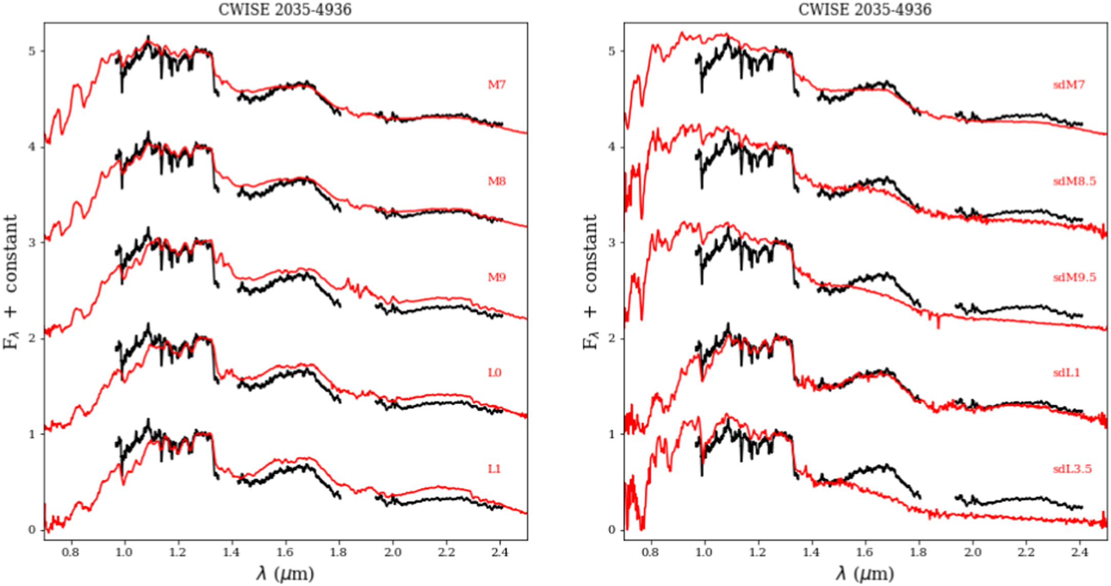 Figure 1. Left: spectrum of CWISE J2035–4936 (black) compared to the spectral standards VB 8 (M7) (Kirkpatrick et al. 2010), VB 10 (M8) (Kirkpatrick et al. 2010), LHS 2924 (M9) (Kirkpatrick et al. 2010), 2MASS 0345+2540 (L0) (Kirkpatrick et al. 2010), and 2MASS 2130-0845 (L1) (Kirkpatrick et al. 2010). Right: CWISE J2035–4936 compared to LHS 377 (sdM7) (Gizis 1997; Greco et al. 2019), 2MASS 0142+0523 (sdM8.5) (Burgasser et al. 2007; Greco et al. 2019), SSSPM 1013 (sdM9.5) (Kirkpatrick et al. 2014), and 2MASS 1756+2815 (sdL1) (Kirkpatrick et al. 2010; Greco et al. 2019), and SDSS J1256-0224 (sdL3.5) (Burgasser et al. 2009; Greco et al. 2019) All spectra were normalized between 1.27 and 1.29 μm and separated by a constant.