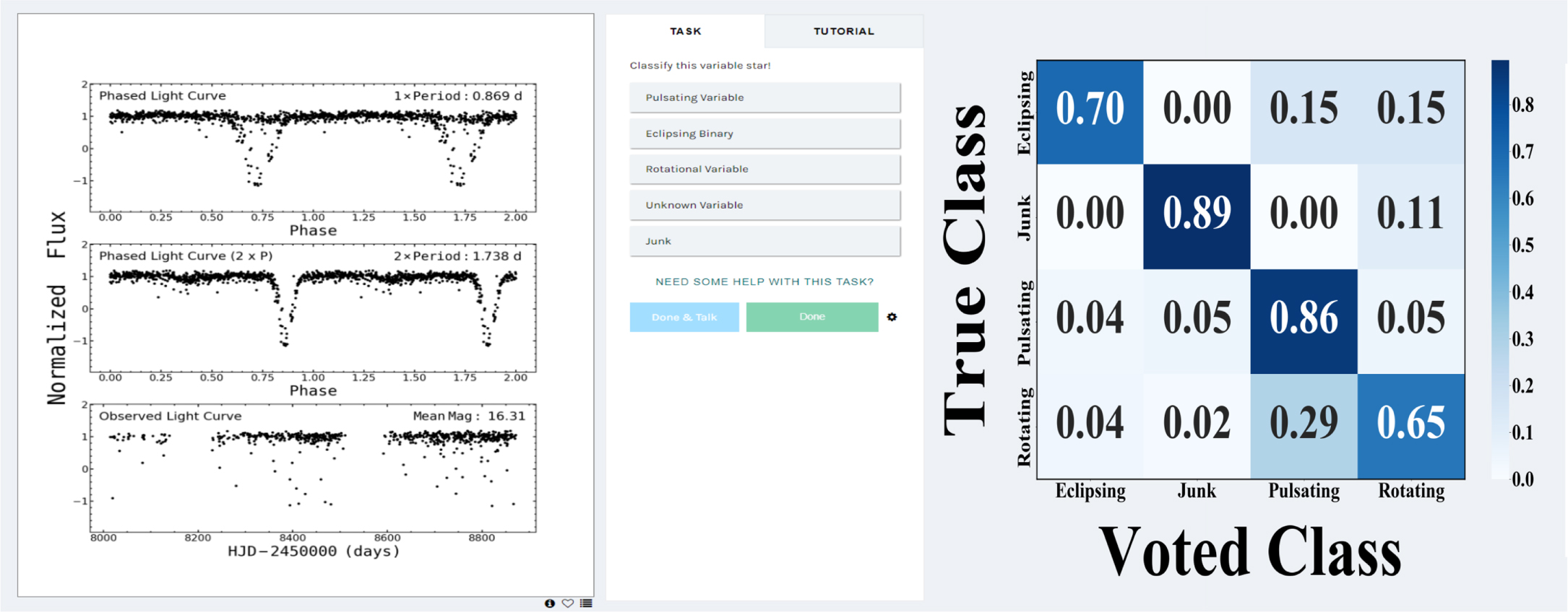 Figure 1. (Left) A snapshot of the Citizen ASAS-SN classification workflow. For this particular candidate, the correct classification is Eclipsing Binary. (Right) The confusion matrix from our internal review.