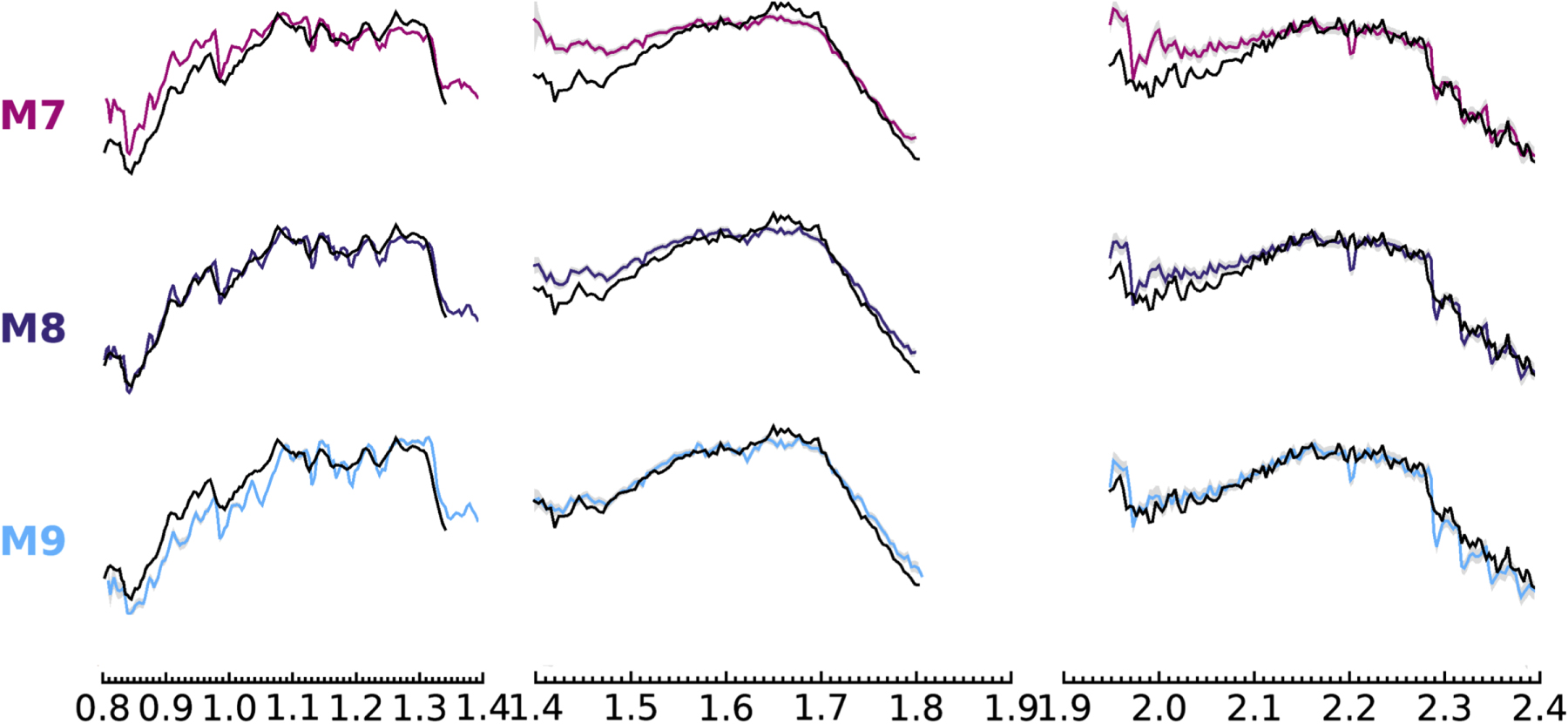 Figure 1. IRTF/SpeX 0.8–2.4 μm spectrum of 2MASS J13173072+4833343, compared with M7, M8, and M9 spectral templates (Gagné et al. 2015). We determine a near-infrared spectral type of M8.5. Built with the method described as per (Cruz et al. 2018). The IRTF/SpeX FITS spectrum shown this figure is available as the Data behind the Figure.(The data used to create this figure are available.)