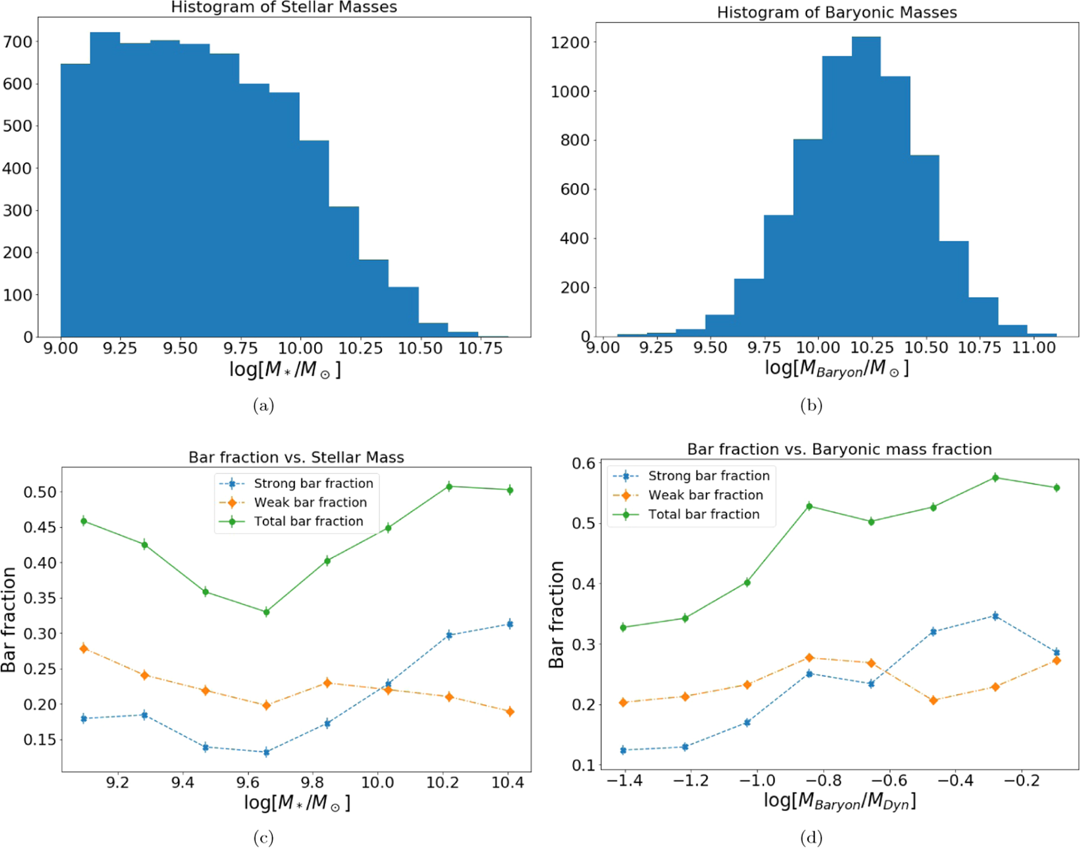 Figure 1. The top panels show the distribution of stellar and baryonic mass respectively in the sample. We limited the lower bound of the stellar mass to 109 M⊙ to include a larger range of redshifts. Figures (c) shows the bar fraction with respect to stellar mass. There is an increase in the strong bar fraction and total bar fraction, while there is a mild decrease in the weak bar fraction. Figure (d) shows the bar fraction plotted against baryon mass fraction. The strong bar fraction and total bar fraction shows an increasing trend. However, there is no significant trend for the weak bar fraction. The error bars in figures (c) and (d) come from the poisson counting error.