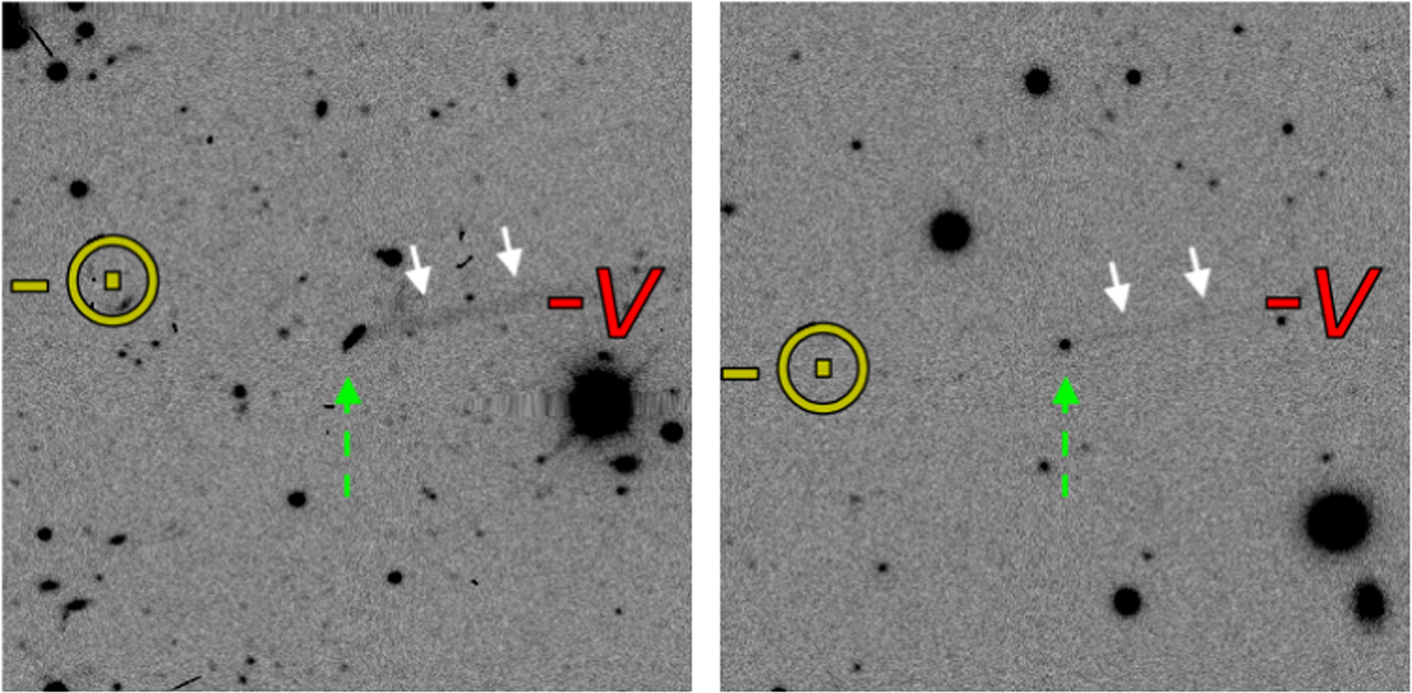 Figure 1. 2015 FW412 (green dashed arrow) displays a tail (white arrows) in the anti-motion (−v) direction in these images from the DECam on the Blanco 4 m telescope (Cerro Tololo Inter-American Observatory, Chile). Also indicated is the anti-solar (-⊙) direction. The FOV is about 126'' × 126''. Left: 430 s VR-band, UT 2015 April 13 (Program 2015A-0351, PI Sheppard, observers S. Sheppard, C. Trujillo). Right: 40 s VR-band, 2015 April 18 (Program 2013B-0536, PI Allen, observers L. Allen, D. James).