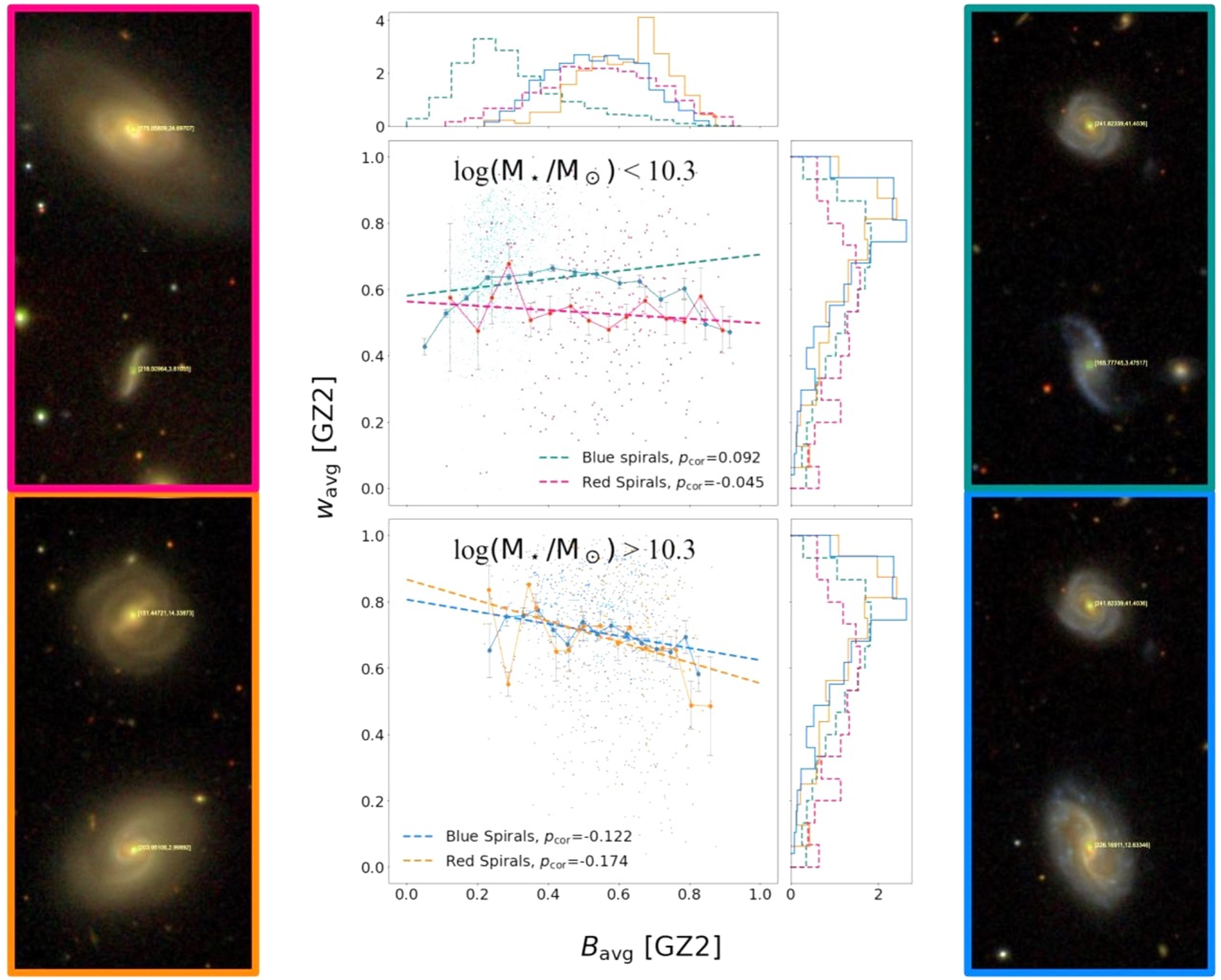 subset subdivided into blue (Ngal = 758), and red (Ngal = 218) spirals (blue and orange data points and lines). Histograms of bulge size and winding score are also shown for all subsets. (Side): Example images of tightly and loosely wound spiral galaxies in each subset; blue spirals on the right, red at left, low mass at upper, and high mass lower.