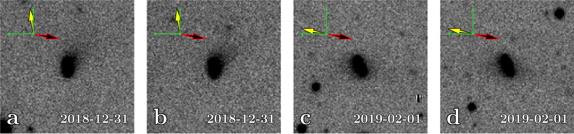 We identified five images of 2018 VL10 showing activity, spanning UT 2018 December 31 (heliocentric distance rH = 1.419 au, true anomaly angle f = 0°) to 2019 March 3 (rH = 1.598 au, f = 43°). Two images each from UT 2018 December 31 and 2019 February 1 (Figure 1) show strong evidence of activity in the form of a diffuse tail. A UT 2019 March 3 image (not shown) shows weak, diffuse signal in the anti-motion direction.
