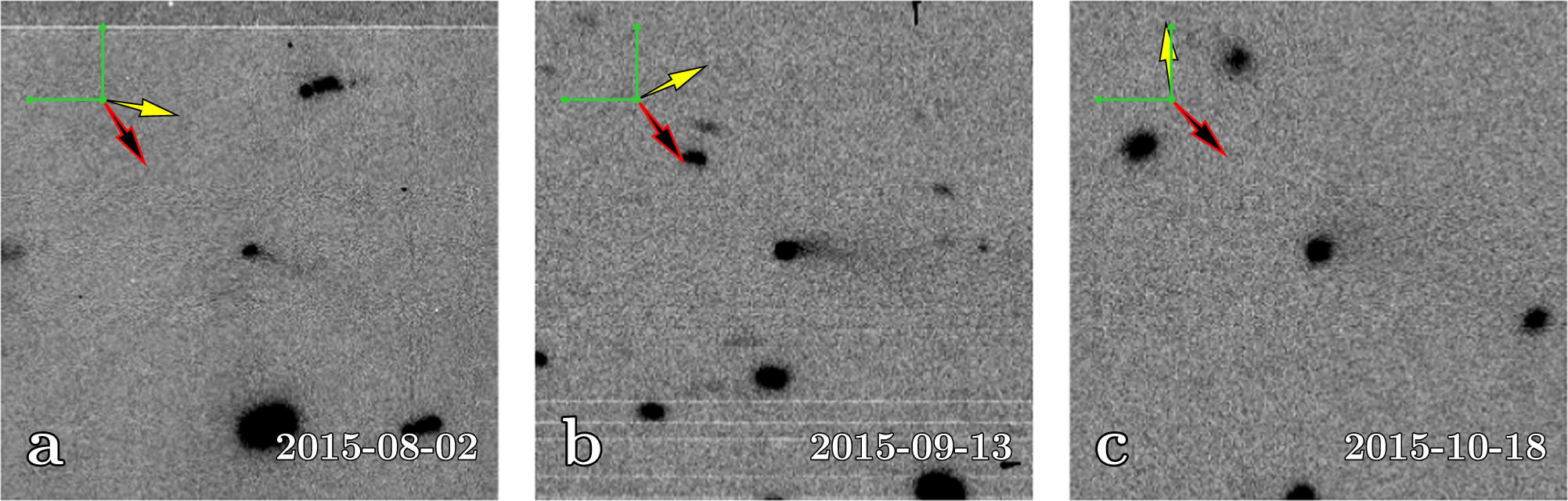 Active Asteroids volunteers identified 2015 VP51 as showing activity in one DECam image from UT 2015 October 18. We then searched additional public archives for images potentially containing 2015 VP51, finding eight more exposures showing activity (Figure 1): four VLT Survey Telescope (VST; M. Arnaboldi et al. 1998) OmegaCAM (K. Kuijken 2011) images from UT 2015 August 2 (true anomaly angle f = 38°), three DECam images from UT 2015 September 13 (f = 50°), and one additional DECam image from the same night as the image identified by project volunteers: UT 2015 October 18 (f = 60°). This gives us nine total images of 2015 VP51 between UT 2015 August 2 and October 18 showing activity.