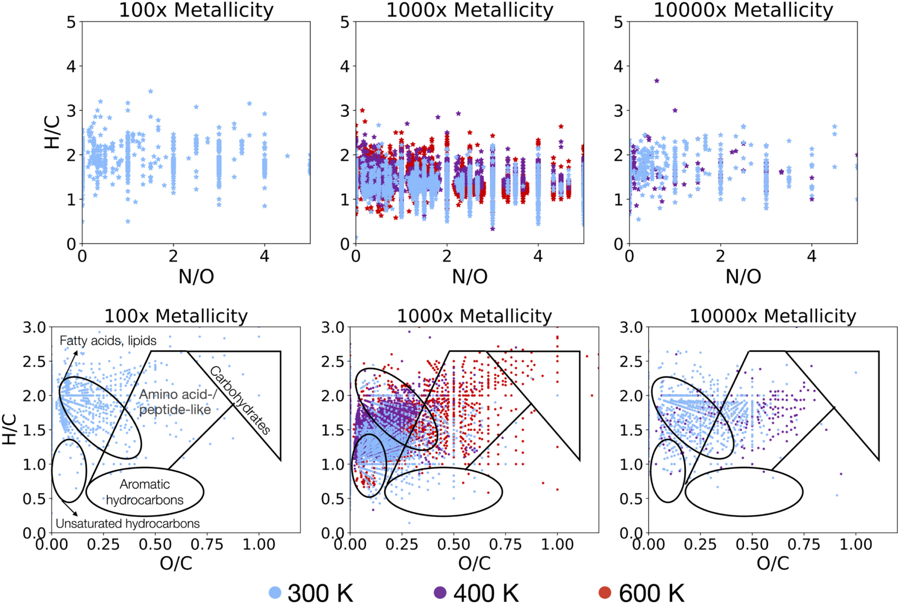 Figure 8. Van Krevelen diagrams of each measured set of samples, showing the hydrogen-to-carbon vs. nitrogen-to-oxygen ratios (top row) and hydrogen-to-carbon vs. oxygen-to-carbon ratios (bottom row) in each set of solid haze analog material. The red symbols correspond to the 600 K samples, purple to 400 K samples, and blue to 300 K samples. The labels of compound regions on the lower 100× plot apply to the entire lower row.