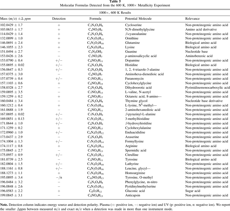 Table 9. Molecular Formulas Detected from the 10,000× Metallicity Experiments