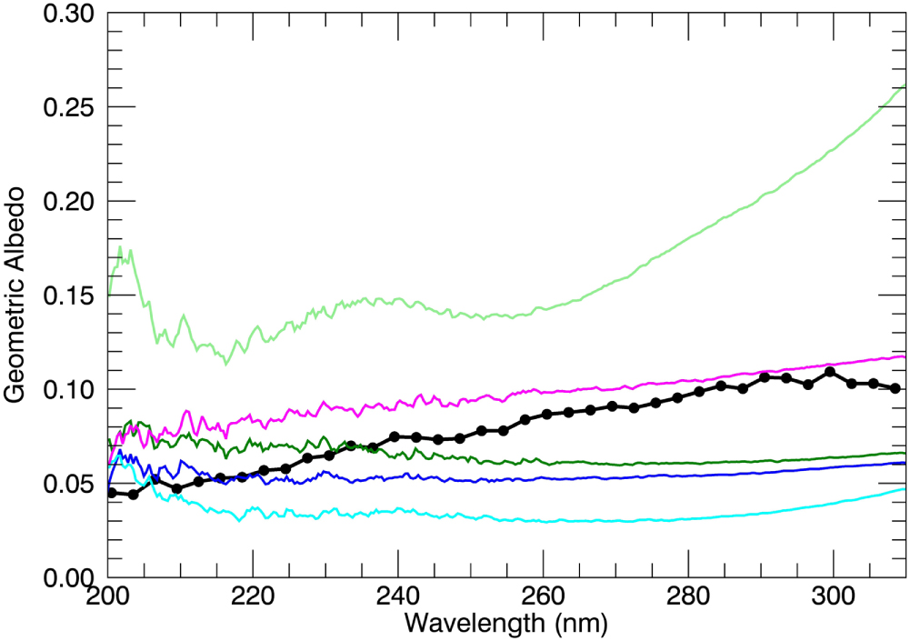 Standard image High-resolution imageThe IUE data exhibit a peak near 235–240 nm. The HST data similarly show an increase in albedo for several data points when binned to 1 nm, but we interpret that possible peak to be the edge of the 250 nm absorption feature when binned to 3 nm resolution, as shown in Figure 5.