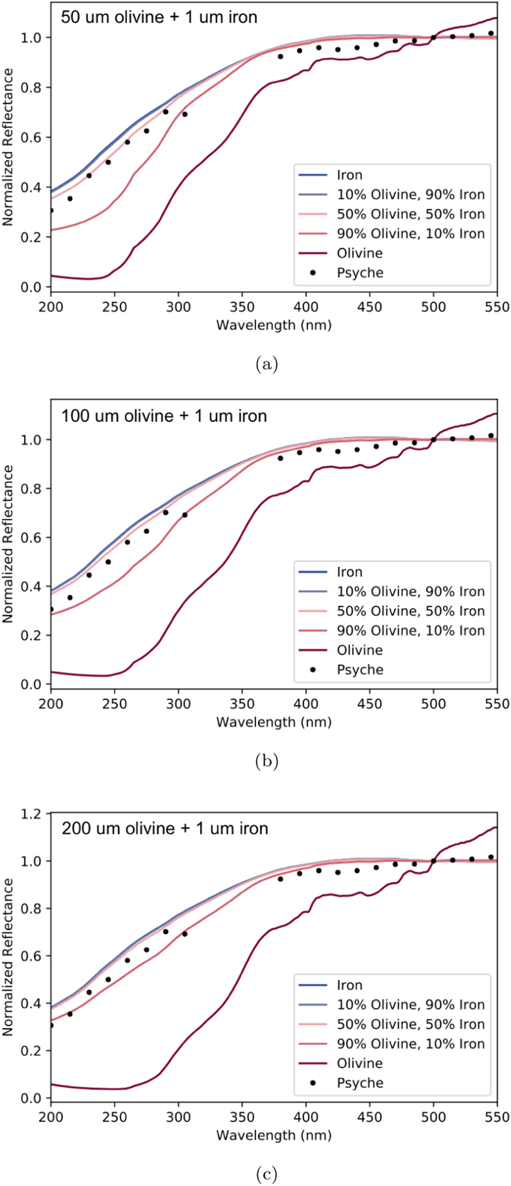 Standard image High-resolution imageWe use olivine rather than pyroxene in these models primarily because olivine optical constants in the UV–Vis spectral region are available in the Jena database of optical constants. We expect that the reflectance of an intimate mixture of pyroxene and iron would similarly be dominated by the iron spectrum. The strong influence of small iron grains, and the limited number of available optical constants for representative silicates, makes it difficult to quantify how much iron may be on the surface of Psyche if the regolith is intimately mixed.
