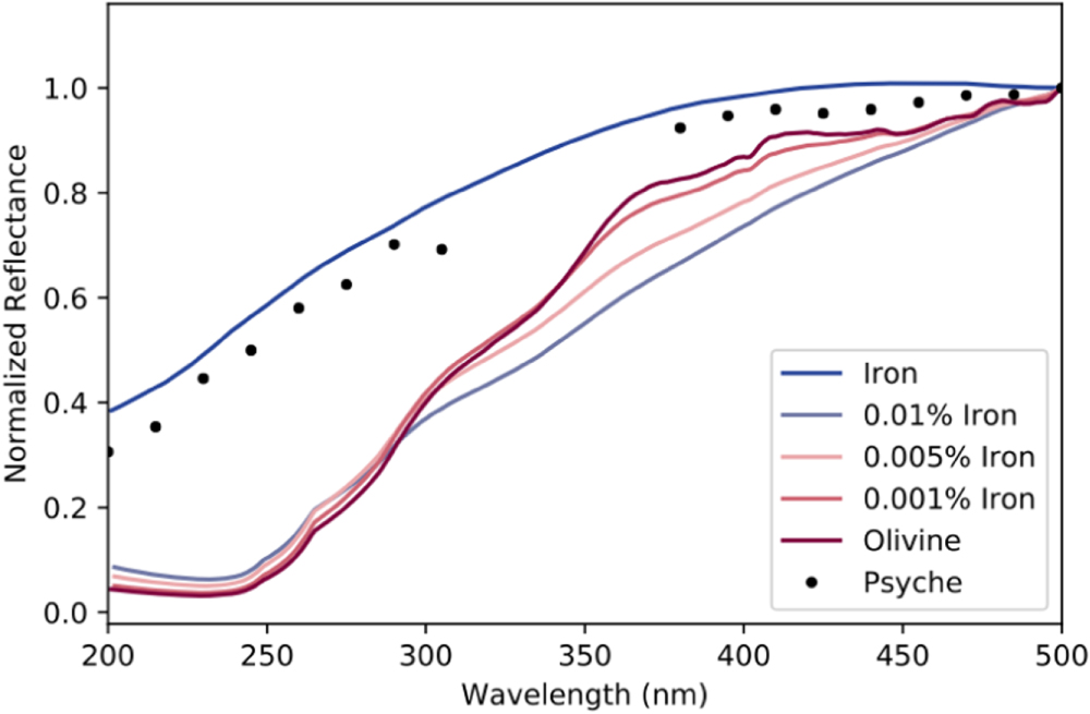 Standard image High-resolution imageThe mixture models show that the addition of iron to the meteorite spectra can improve how well they match the UV–Vis data of Psyche, though we do not find a satisfactory analog for the asteroid using any single material or mixture of materials. This is likely a result of several issues, including the extremely limited spectral database at UV wavelengths for the relevant materials and the sensitivity of the UV spectrum to the materials' grain sizes.
