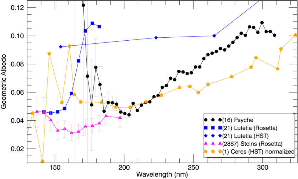 Figure 17. Comparison of the geometric albedos for Psyche with Rosetta Alice observations of (2867) Šteins (purple triangles) and (21) Lutetia (blue squares), HST observations of (21) Lutetia (blue diamonds), and HST STIS observations of (1) Ceres (orange stars). These are the only four asteroids studied at wavelengths <220 nm, and their spectra appear very different from one another at these wavelengths.