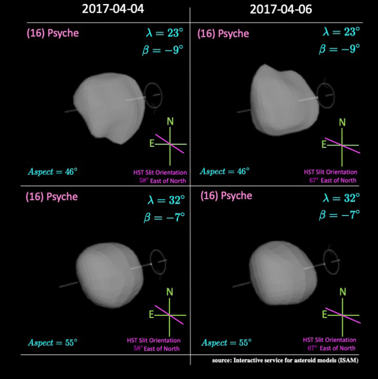Figure 1. Orientation of Psyche at the time of the two HST observations assuming the shapes and pole orientations determined by Hanuš et al. (2017; top row) and Kaasalainen et al. (2002; bottom row). The data were taken 12.499 rotations apart and observe different longitudes on the surface, though the relative orientation of the asteroid was such that much of the northern hemisphere was observed during both data acquisitions. The angular size of Psyche was ∼013 for both observations, well within the 02 width of the slit. Along the slit, Psyche occupies ∼5 pixels, using the 0025 plate scale for STIS. Figures were generated using the Interactive Service for Asteroid Models found at http://isam.astro.amu.edu.pl/ (Marciniak et al. 2012).