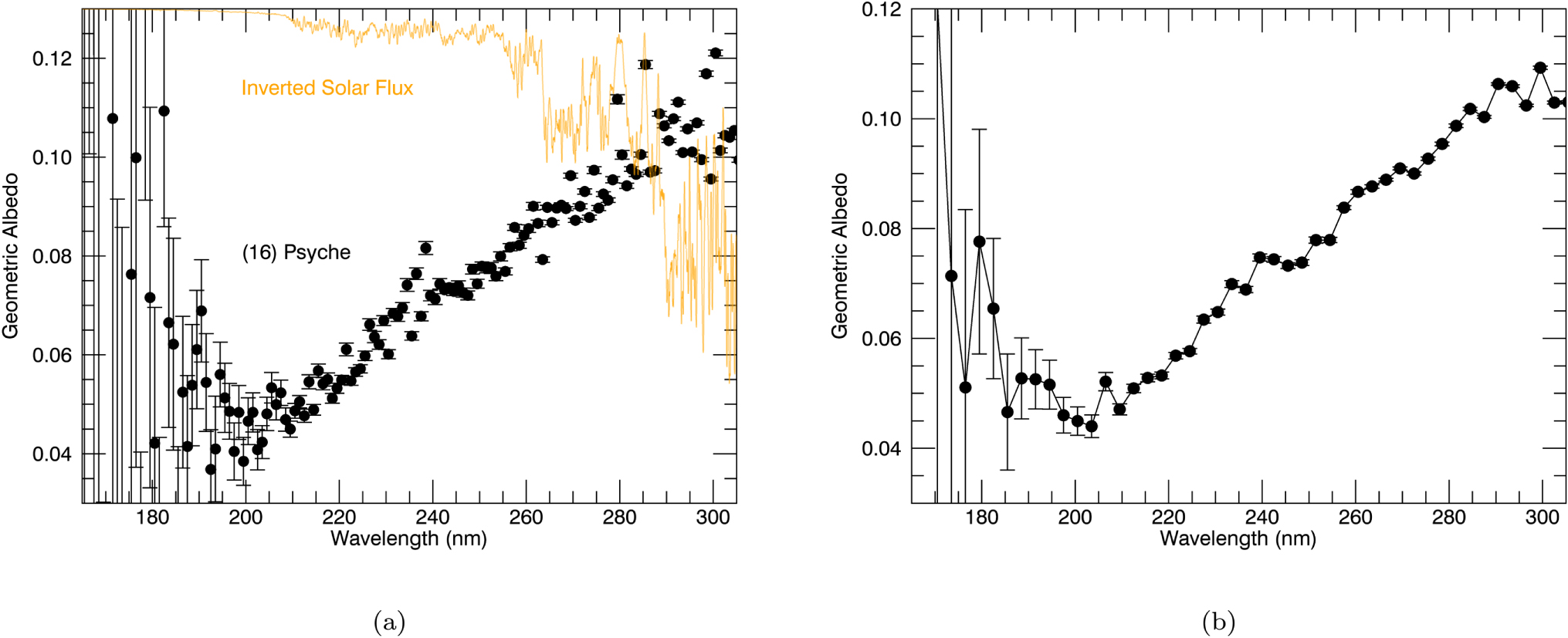 where D is the Earth–Psyche distance in astronomical units, Δ is Sun–Psyche distance in km, RP = 113 km is the effective radius of Psyche, f is a unitless phase correction factor, F(λ)P is the flux of Psyche from STIS at each wavelength, and F(λ)Sun is the SOLSTICE solar flux observed at 1 au at each wavelength, where the flux is given in erg cm−2 s−1 Å−1. We assume a phase curve similar to that measured at visible wavelengths, which would indicate a phase correction factor of 1.8 for these observations (Lupishko et al. 1980). This is also consistent with the rough UV phase curve for Psyche presented by Roettger & Buratti (1994) with corrections made using IUE spectra of Psyche by Butterworth & Meadows (1985), though the wavelength-dependent phase curve could be different at shorter wavelengths. The 3% uncertainty in the SOLSTICE-measured solar flux (Sparn et al. 2005) has not been included in these albedo calculations.