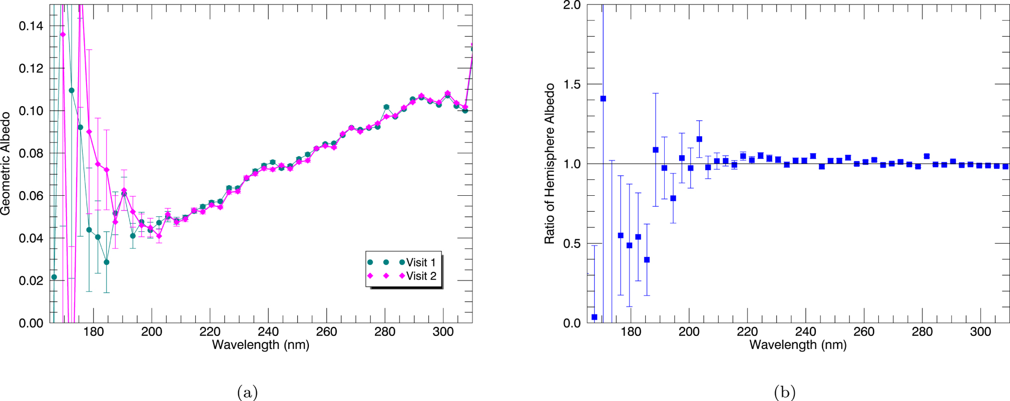 We used solar flux spectra from the Solar Radiation and Climate Experiment (SORCE)/Solar–Stellar Irradiance Comparison Experiment (SOLSTICE) instrument (McClintock et al. 2005) acquired on dates matching those of our STIS observations but was shifted by one day to correct for solar rotation. The solar spectra were binned in the same fashion as the STIS spectra and were used to calculate geometric albedo p in each wavelength bin according to Equation (1):