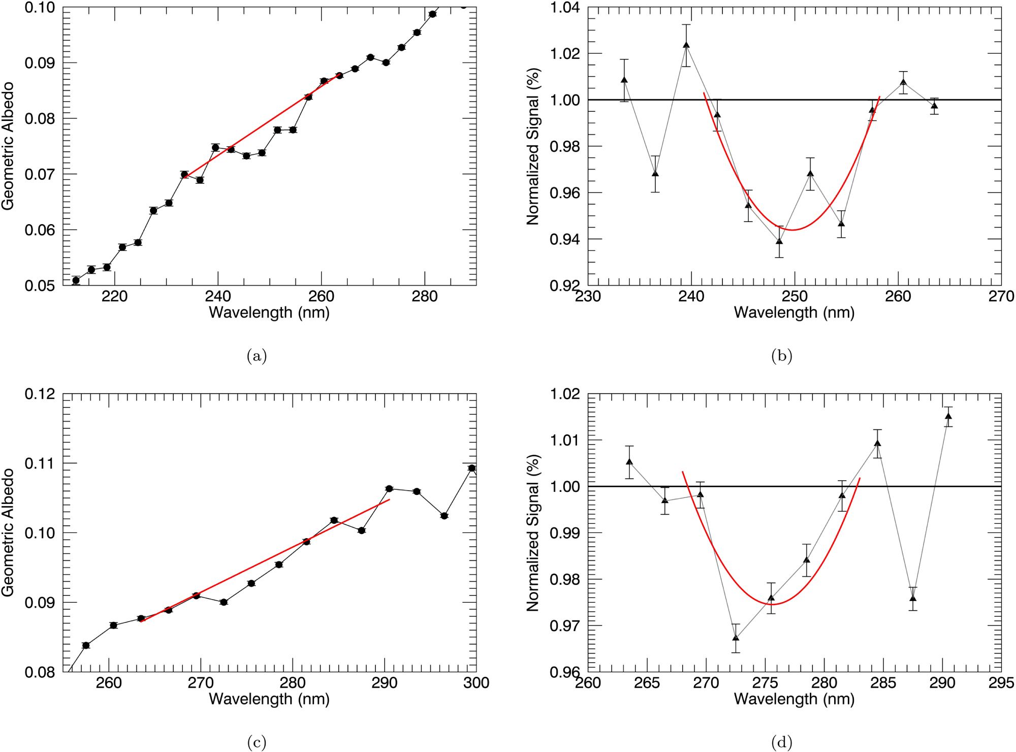 As discussed in Section 3, we identified two clear spectral features centered near 250 and 275 nm. To measure the strength of these features, we determine the background continuum slope by fitting a line to the spectrum on either side of the feature and then dividing by that baseline to remove the local continuum. For the 250 nm feature, we use the average albedo between 233.5 and 239.5 nm and between 257.5 and 263.5 nm to establish the baseline (Figure 5(a)). For the 270 nm feature, we find the average albedo between 263.5 and 269.6 nm and between 284.5 and 290.5 nm to find the baseline (Figure 5(c)).