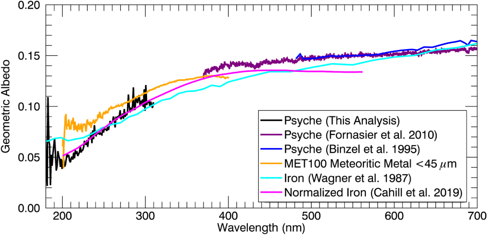 Like the albedo of Psyche, the spectrum of iron from the Wagner et al. (1987) database and the spectrum of iron derived from the optical constants given by Cahill et al. (2019) are fairly flat and featureless. The overall reflectance of the iron from Wagner et al. (1987) is also similar to the asteroid's albedo. Since Psyche is expected to be primarily comprised of metals, it may be unsurprising that iron is a reasonable match. However, the spectra are not an exact match the the UV–Vis spectrum of Psyche and observations of the asteroid at longer wavelengths have shown that other materials such as orthopyroxenes are present as well.
