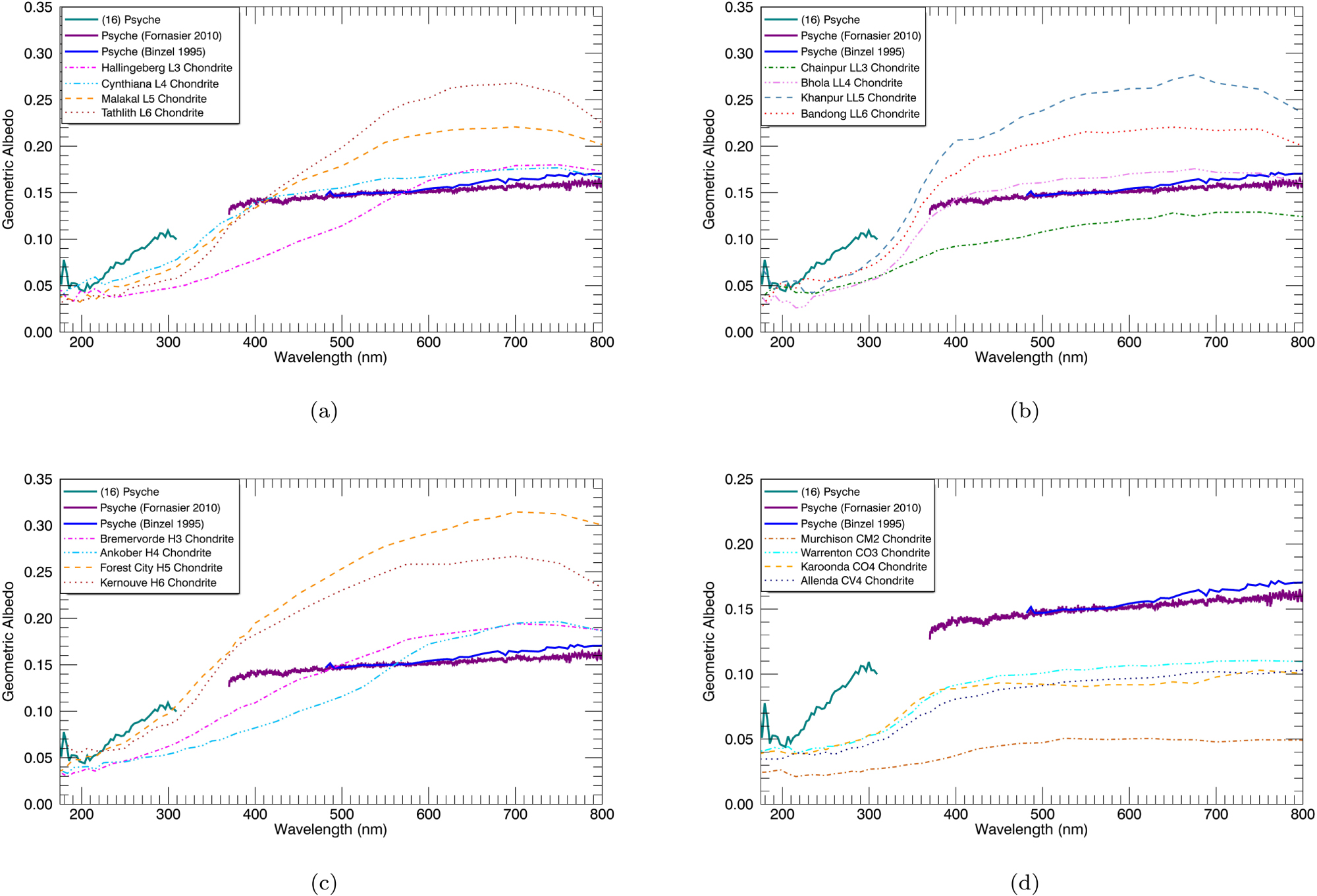 Figure 9. Comparison of the UV–Vis geometric albedo of Psyche with the lab-measured reflectances of L chondrites (top left), LL chondrites (top right), H chondrites (bottom left), and carbonaceous chondrites (bottom right).