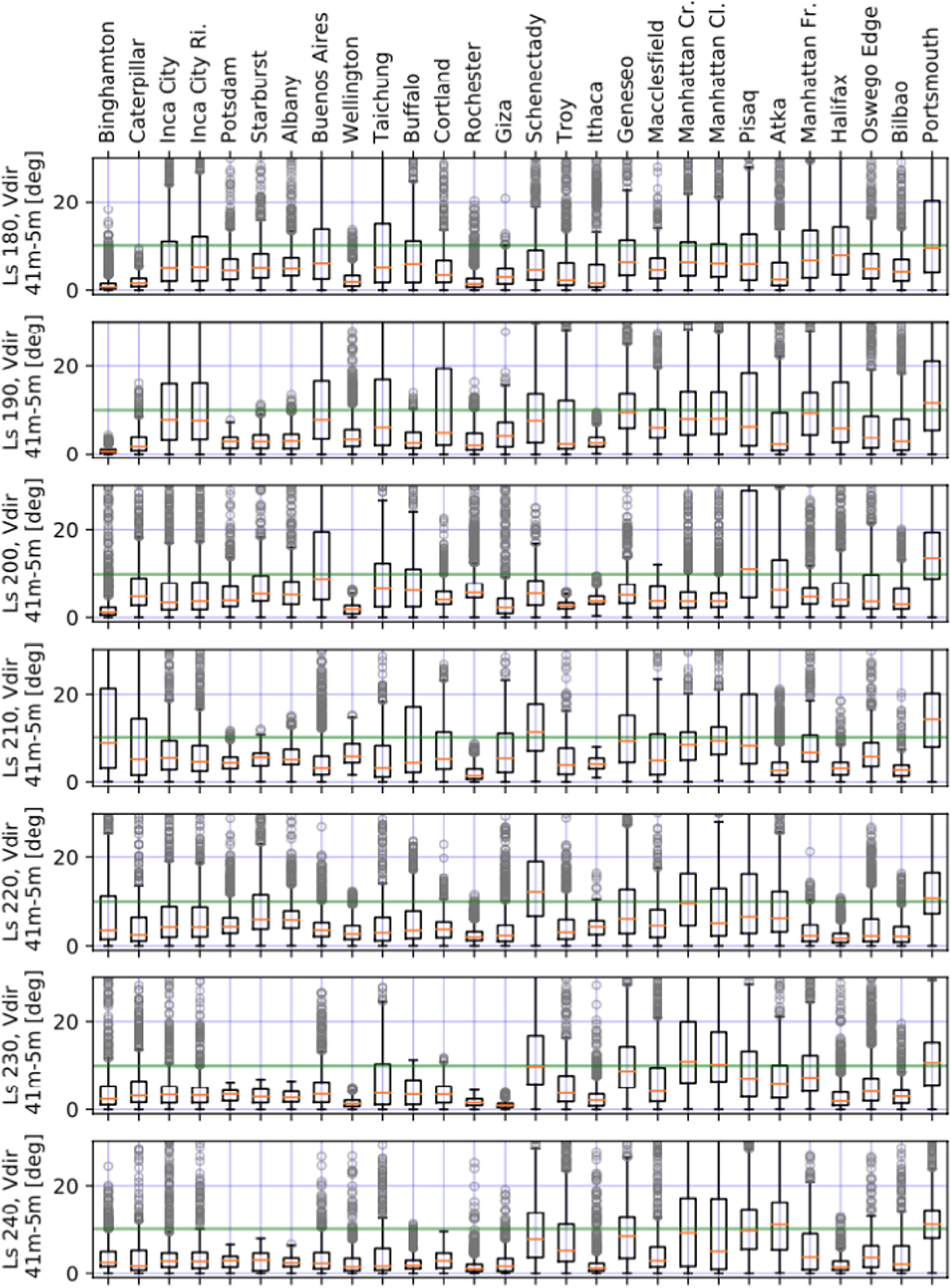 Standard image High-resolution imageThe presence of several vertical and horizontal red lines on the same subplot indicates that several HiRISE images were acquired during the Ls interval between this subplot and the previous one. If any of those lines are instead gray (none at this ROI), it indicates that multiple disparate fan directions are present within each HiRISE image. In the case of Giza (Figure 13), there was just one HiRISE image acquired between Ls ≈ 175° and Ls ≈ 185°, three images between Ls ≈ 185° and Ls ≈ 195°, and so on.