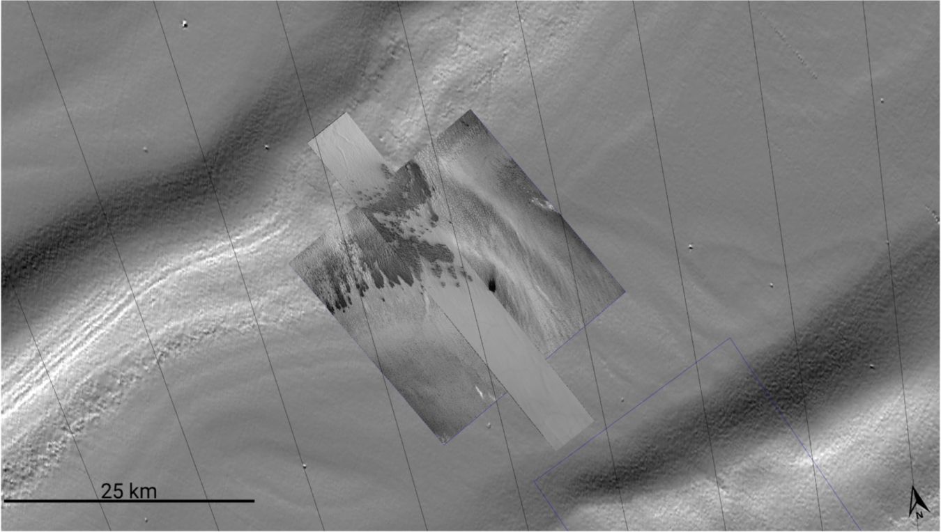 Figure 3. Multiple fan sources in this image show three different discrete fan directions—i.e., there are at least three different episodes of eruptions apparent in this map-projected image. HiRISE image ESP_055687_0935 (86.4 °S, 98.96 °E), acquired at Ls ≈ 192