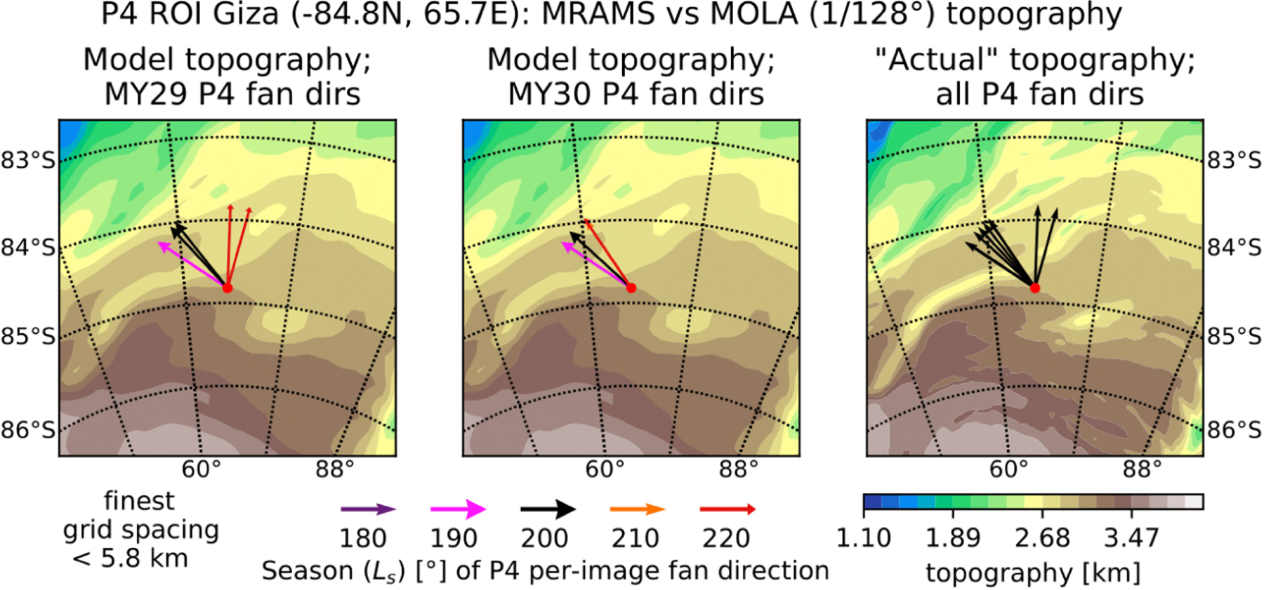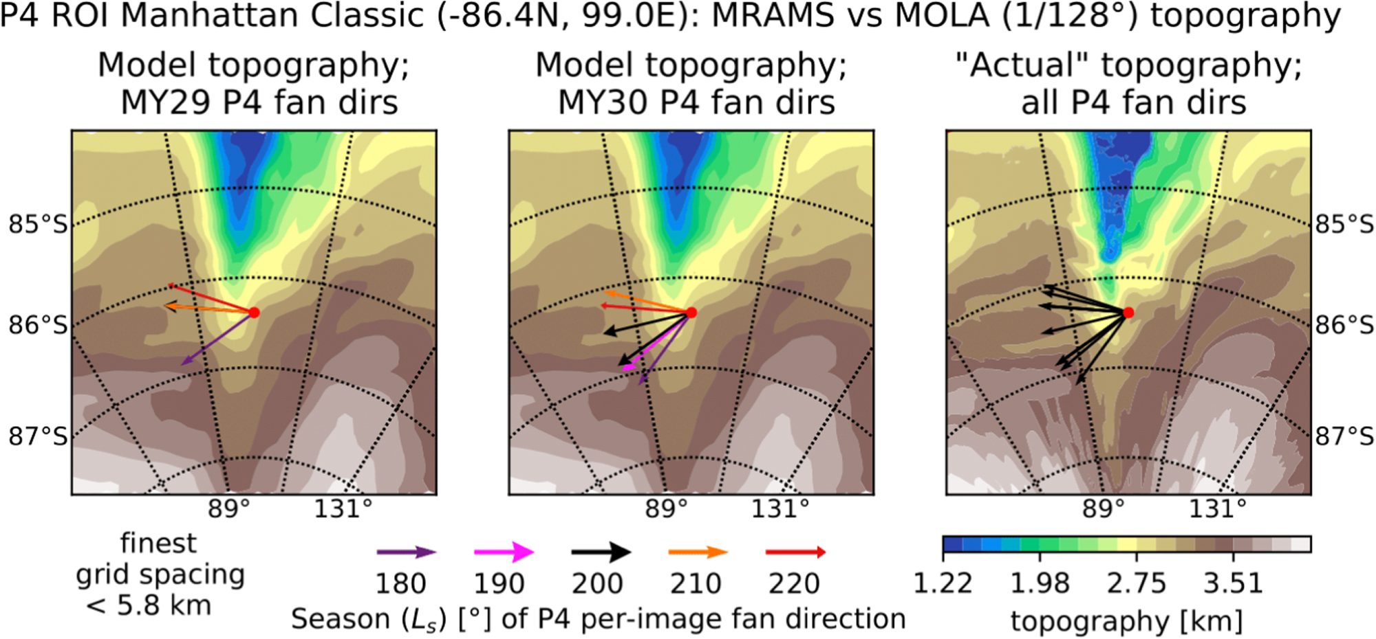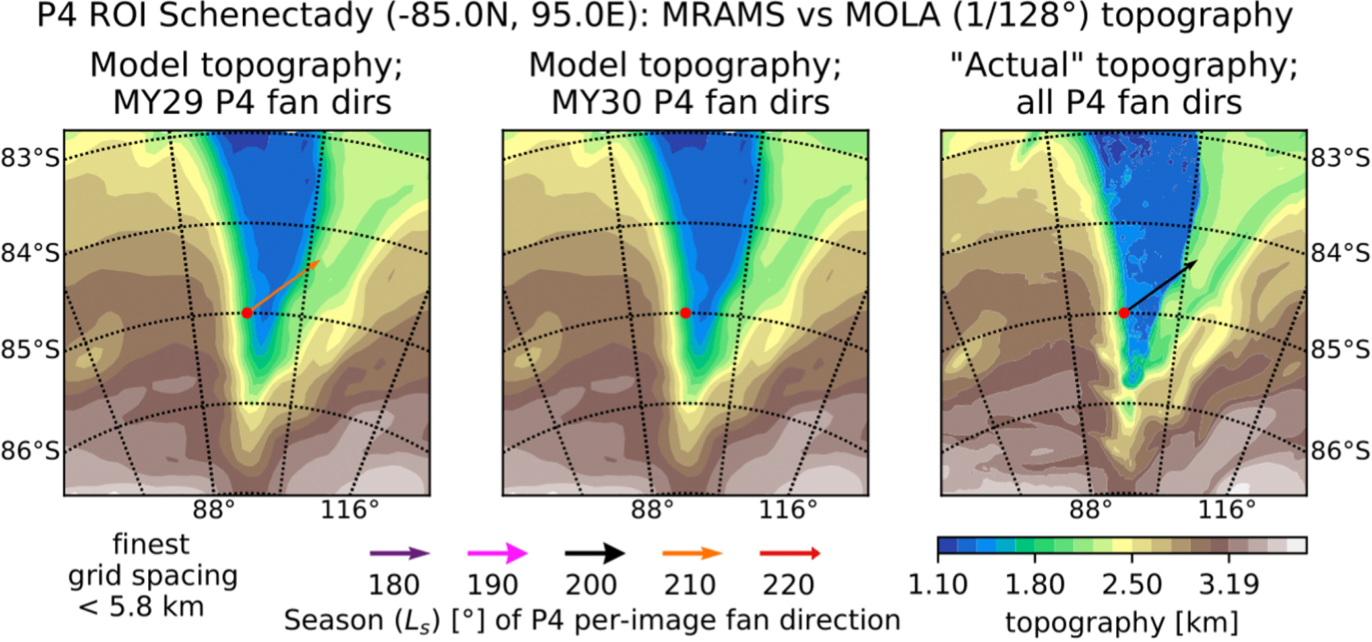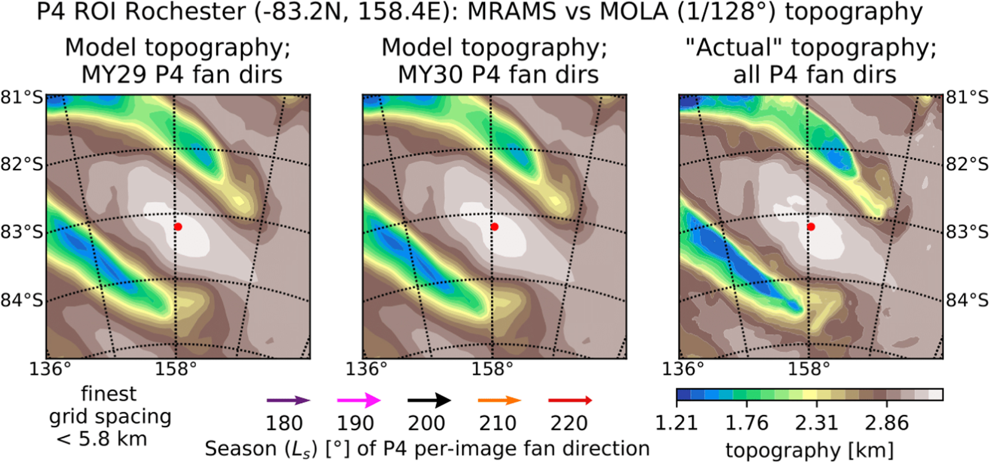 Looking at the wind speeds alone, there are some trends between the magnitudes of MRAMS-estimated and P4-derived values. At some, mostly earlier, Ls the modeled speeds are less than than P4-derived ones, but the majority of MRAMS wind speeds (at the fan direction) are greater in magnitude than their P4-derived counterparts. This is not a surprising outcome considering that P4 estimates for wind speeds are much less constrained compared to the P4-inferred wind directions because of the multiple assumptions that had to be made to calculate speeds from fan lengths. Furthermore, there is an overall tendency at many ROIs for the MRAMS and P4 wind directions to match when the MRAMS winds (and/or vertical wind shear) are at their strongest within each sol. More work to understand CO2 jet eruptions and their strengths, timing, and ability to propel dust/regolith particles into the Martian atmosphere needs to be done before we can narrow down the parameter space of the applied calculation and determine more realistic wind speeds at the time of eruption. On the other hand, the MRAMS configuration used here (with a grid spacing of just over 5 km) also has room for improvement, especially with respect to resolving smaller-scale topography. Gridded MOLA topography is available at a maximum resolution of ∼400 m, and even higher-resolution HRSC, CTX, and HiRISE digital elevation maps are available in certain locations. However, higher resolution results in greatly increased computational expense to run the model, so some compromise is necessary. Longer MRAMS simulations (i.e., more sols of output to analyze per Ls window) may also help better understand the day-to-day wind variability/statistics at each ROI.