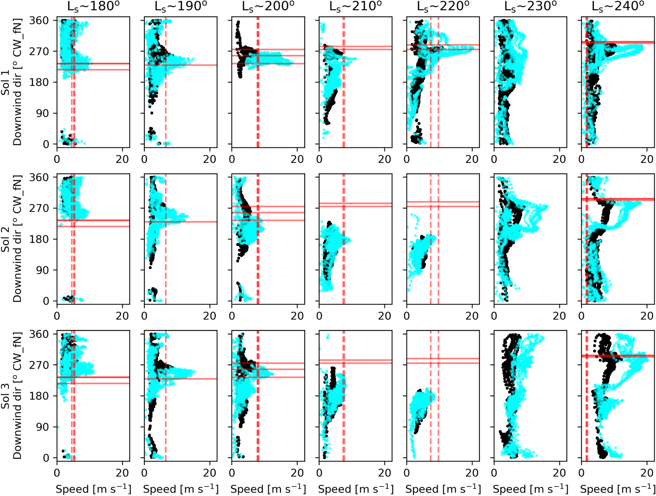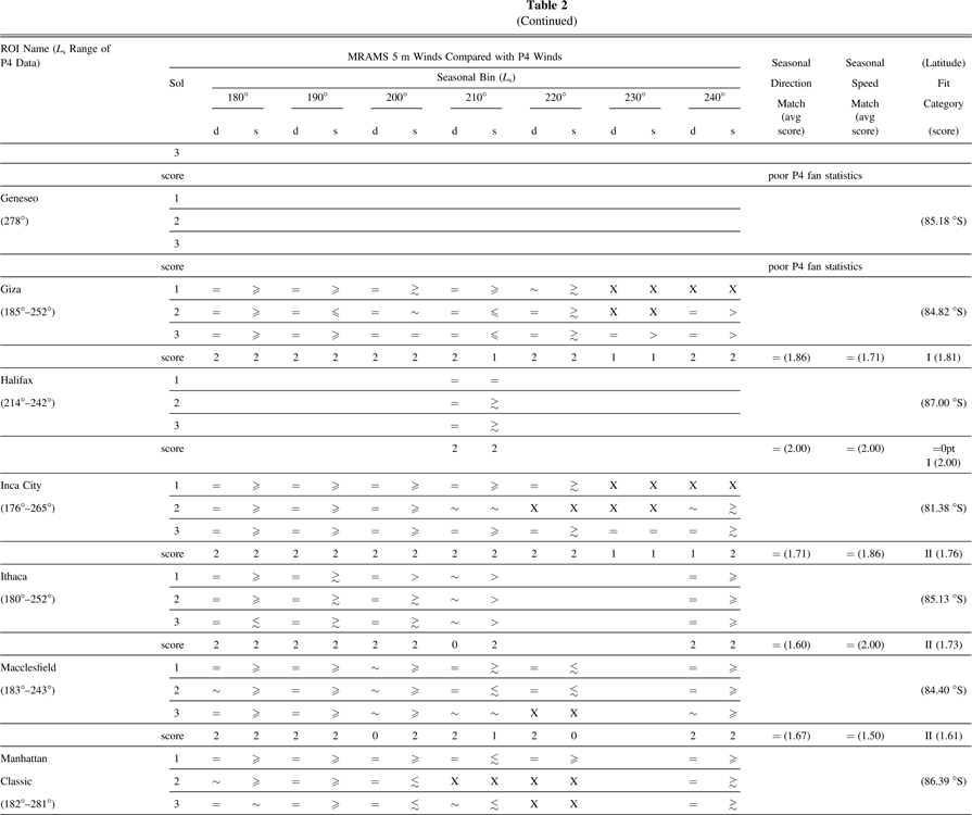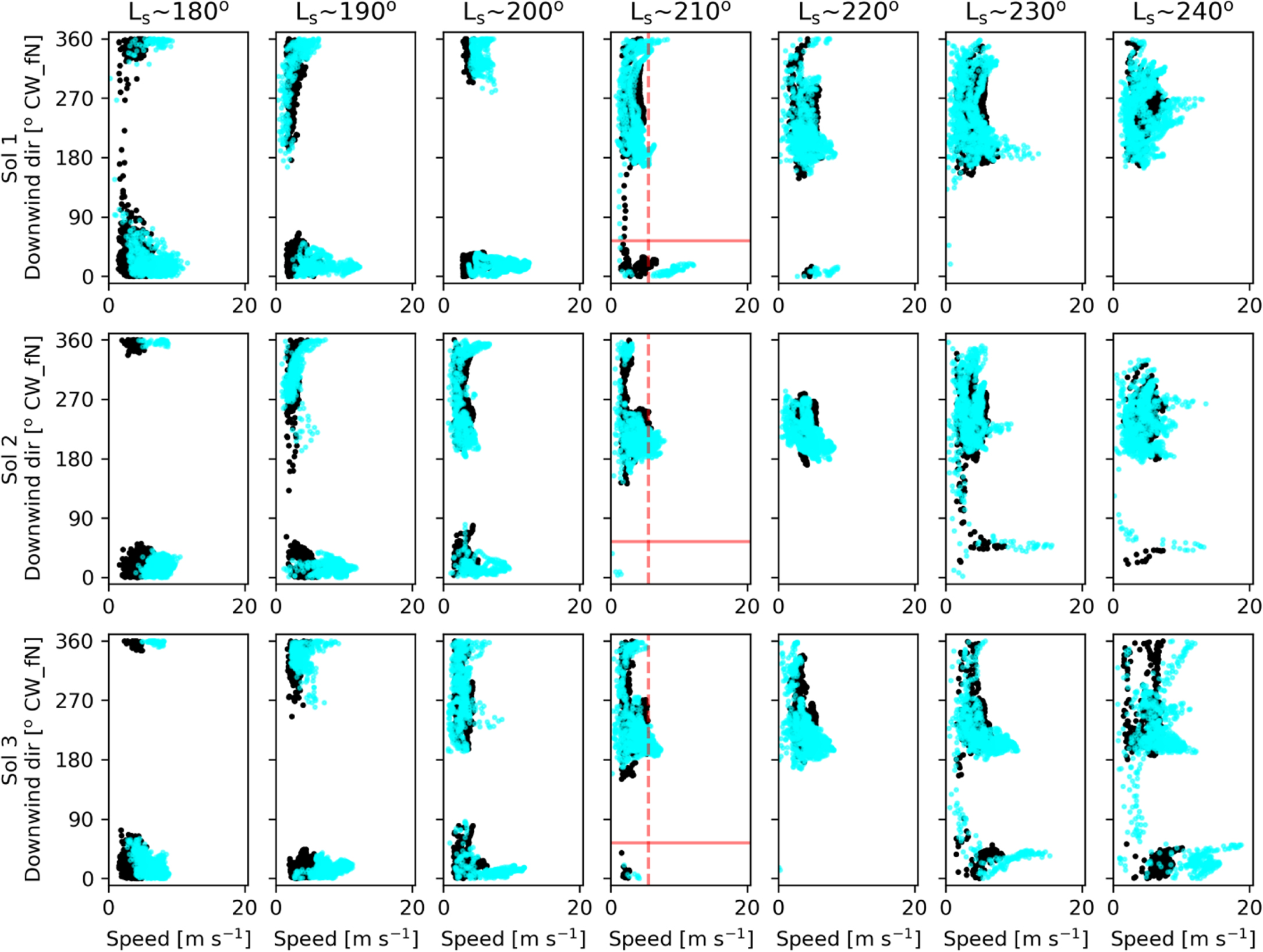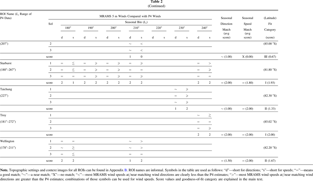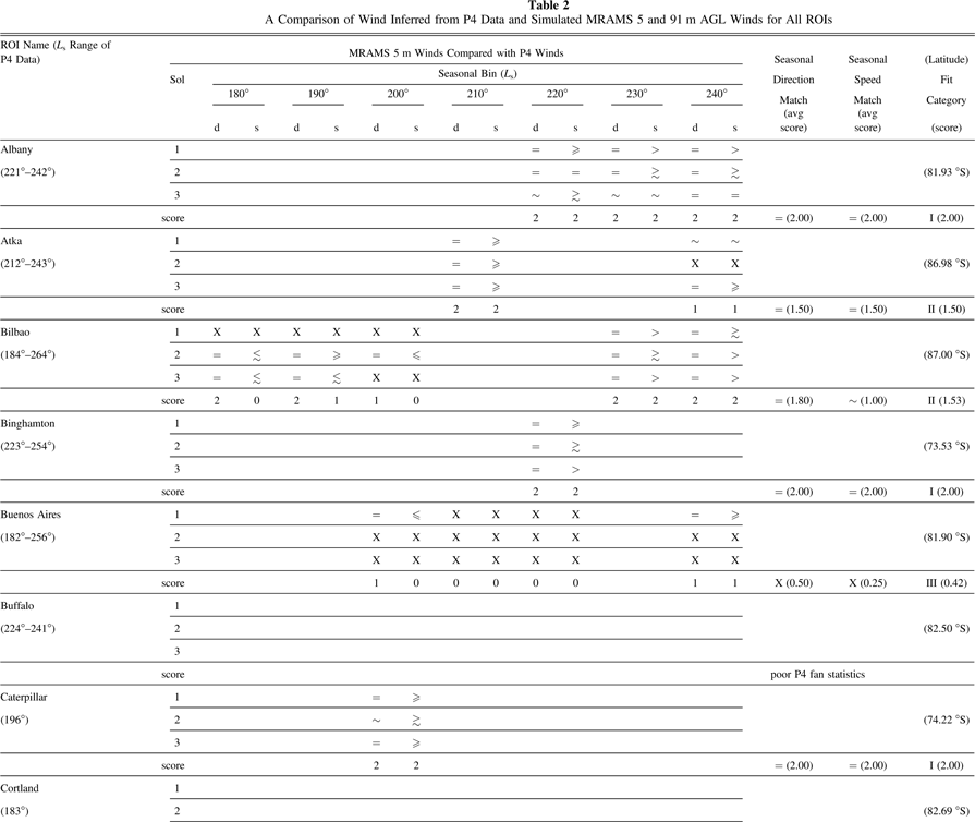 Standard image High-resolution imageTable 2 indicates that at ROI Buenos Aires there are no P4 measurements for the Ls ≈ 180°, 190°, and 230° seasonal windows. The modeled and P4-inferred wind directions do not match at all for the 210° and 220° Ls bins and only match for 1 out of 3 sols within the other two Ls windows.