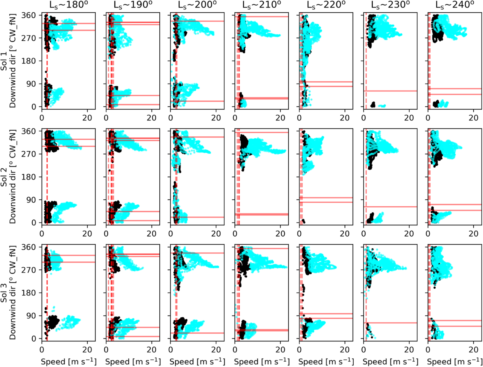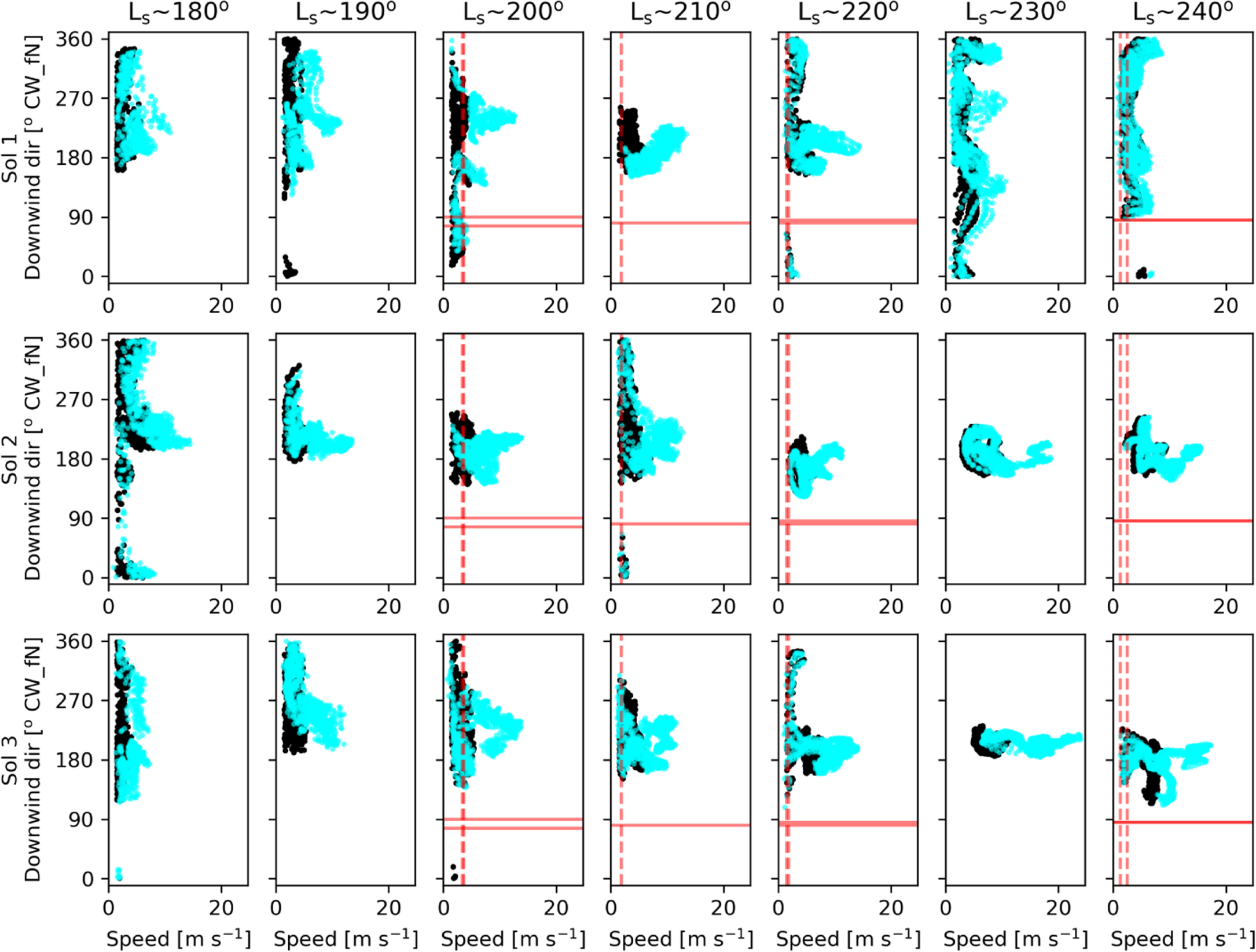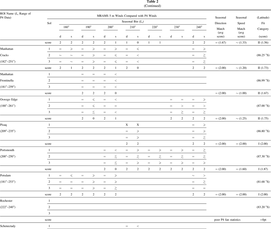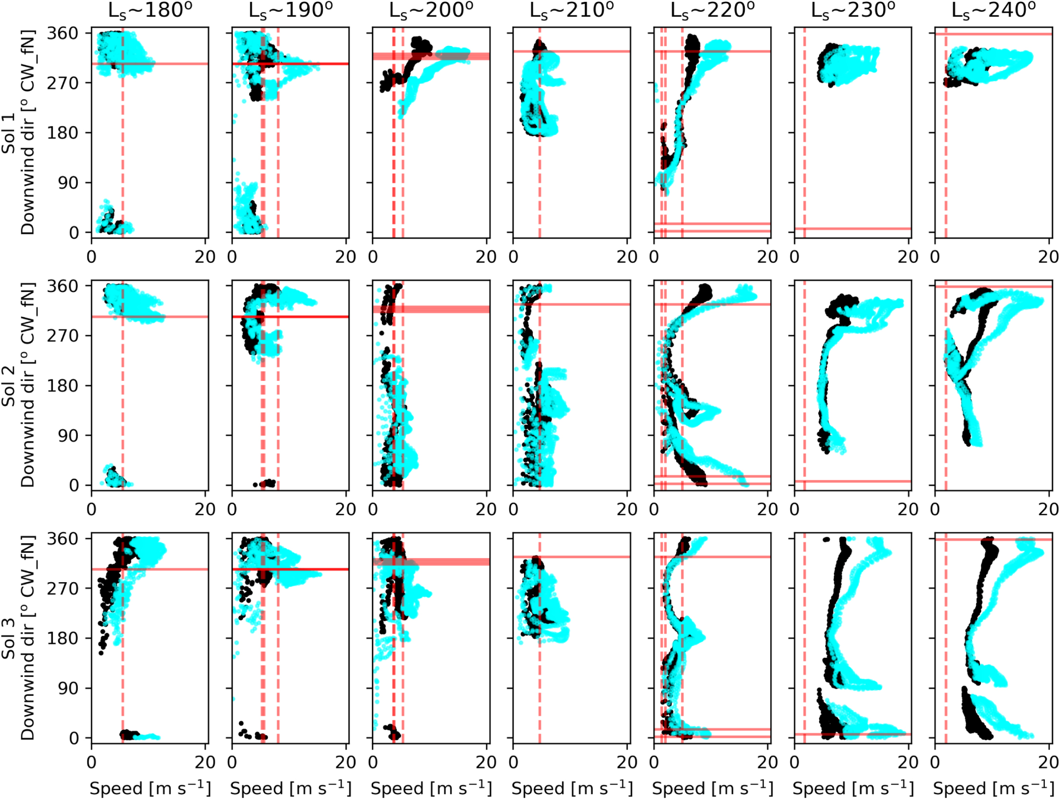Standard image High-resolution imageTable 2 indicates that at ROI Buenos Aires there are no P4 measurements for the Ls ≈ 180°, 190°, and 230° seasonal windows. The modeled and P4-inferred wind directions do not match at all for the 210° and 220° Ls bins and only match for 1 out of 3 sols within the other two Ls windows.