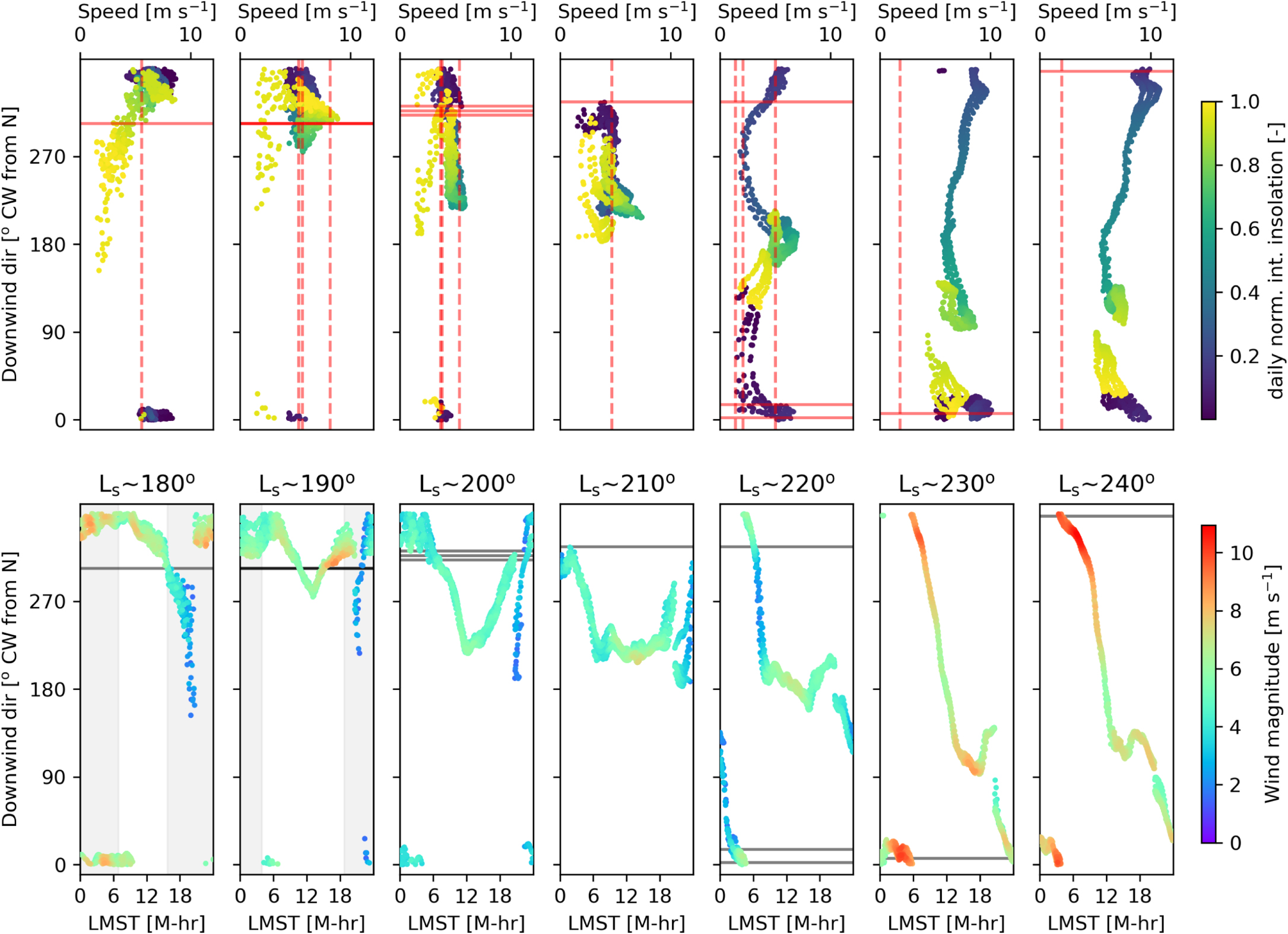 Figure 14. P4–MRAMS comparison at Giza. Each column is a 10° step in Ls and shows sol 3 model output. All horizontal grid points within 8.3 km of the ROI centroid are shown. Top: scatter plots of downwind directions and speeds from MRAMS ∼5 m AGL colored by the daily integrated insolation. Solid horizontal red lines indicate fan directions derived from P4 results, and dashed vertical red lines indicate wind speeds estimated from P4 results. Bottom: scatter plots of downwind direction from MRAMS vs. LMST in Mars hours, colored by wind magnitude. Black lines are P4 wind directions. Shaded regions indicate local night at this location.