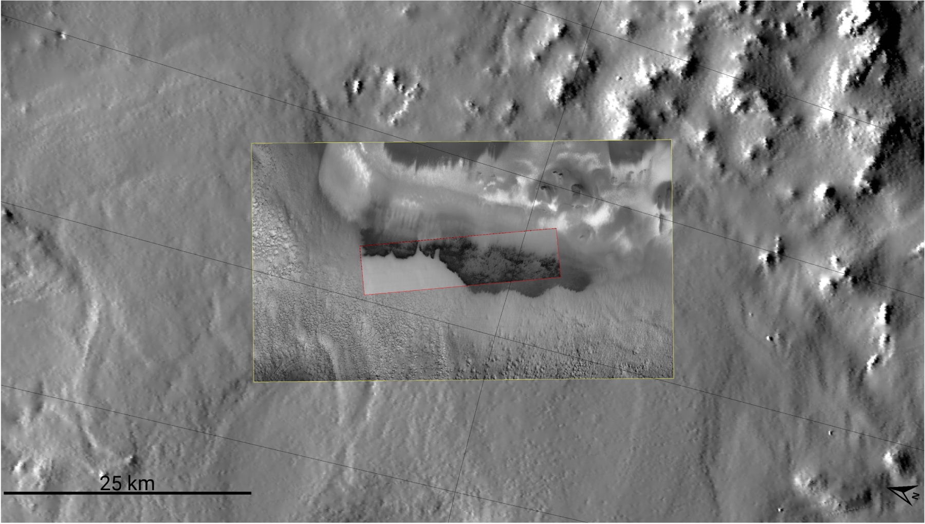 Figure 15. Context of ROI Manhattan Classic (86.4 °S, 99 °E). The background image is MOLA shaded relief, the first insert is a CTX context image (G12_022971_0936_XN_86S261W), and the narrowest highest-resolution insert is HiRISE image ESP_011394_0935_RED. Meridian lines are spaced 2° apart. Direction to north is noted in the lower right corner.