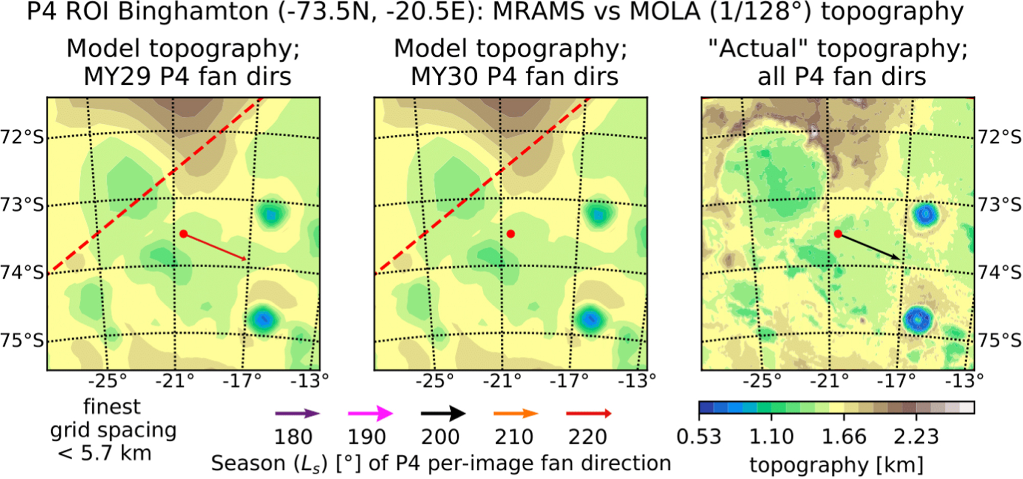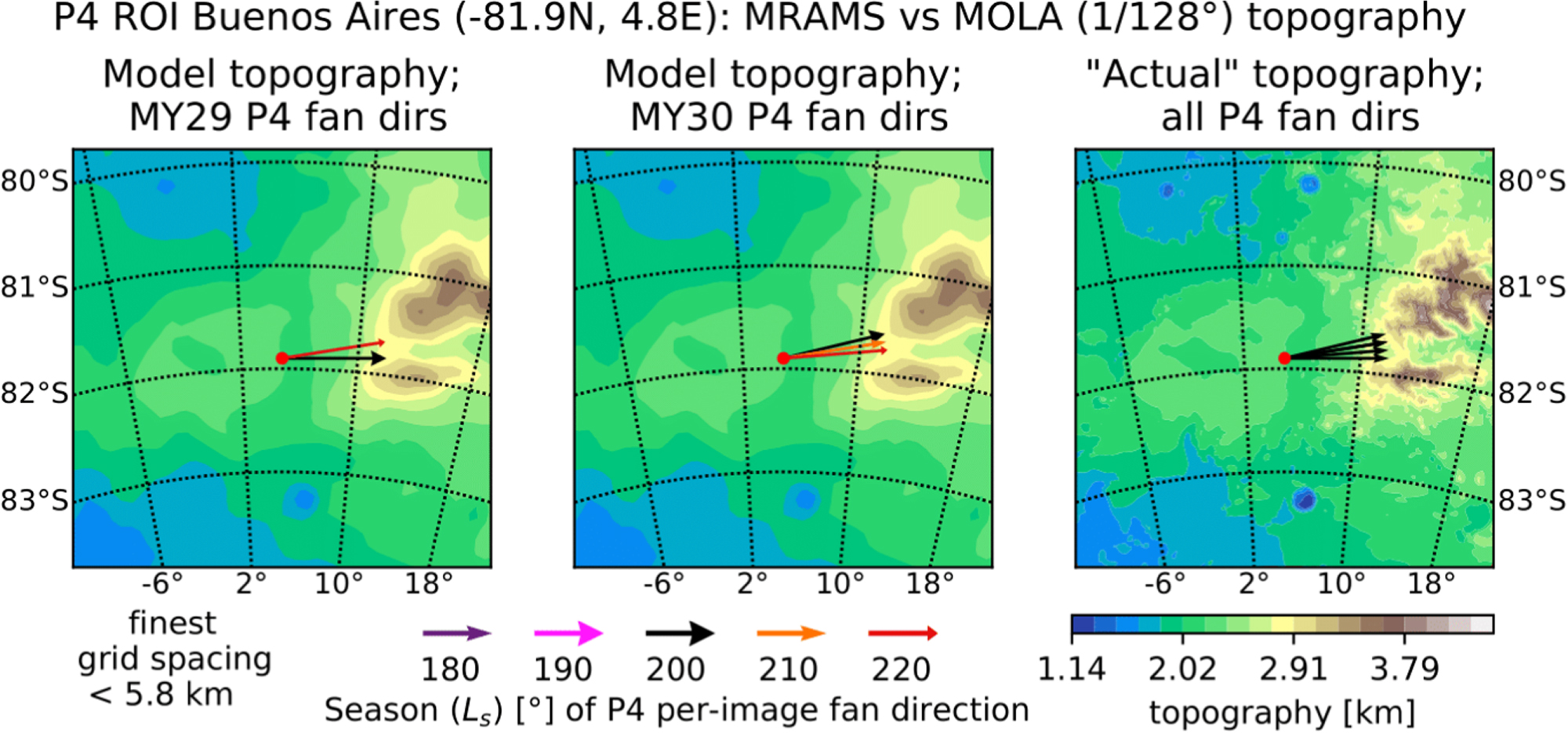 Standard image High-resolution imageIn HiRISE imagery from Ls ≈ 182°–195° (not measured by P4) at Buenos Aires there appear to be multiple fan orientations at each vent that are more consistent with the MRAMS wind directions at those Ls. The HiRISE data then indicate that starting around Ls ≈ 196° the eastward fan orientations become more common, and they are dominant by Ls ≈ 206°—especially in the north and central parts of the ROI. Furthermore, MRAMS output from only 10 km to the east (81.9 °S, 6.0 °E); Figure 20, bottom row) shows wind directions that match the P4-inferred ones—this is only two model grid points away from the ROI centroid. The 3D model output (not shown) also indicates that as the insolation gets stronger in early spring at this ROI, differential heating of the air over the mountains to the east during midday induces upslope flow. Thus, it appears that the apparent severe mismatch between MRAMS and P4-inferred wind directions at ROI Buenos Aires is probably merely due to insufficient horizontal spatial resolution in the model that does not resolve the full complexity of the hilly slope and mountains to the east. The lack of P4 measurements for the earlier Ls windows also played a role in its current categorization.
