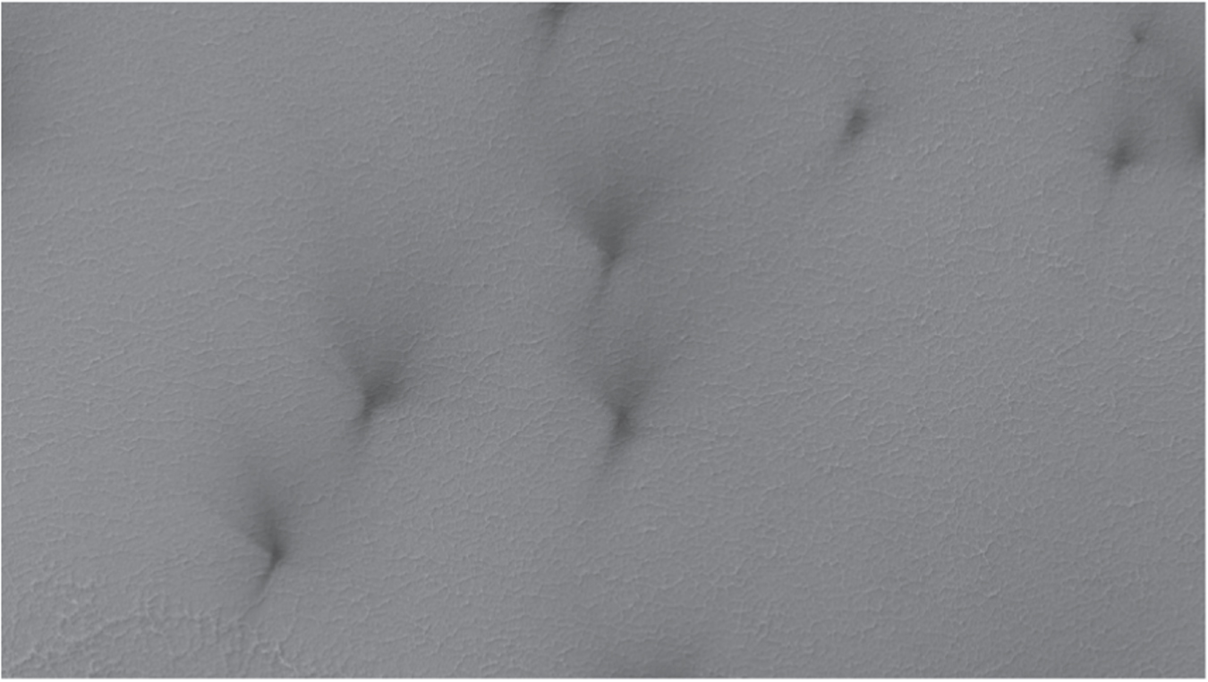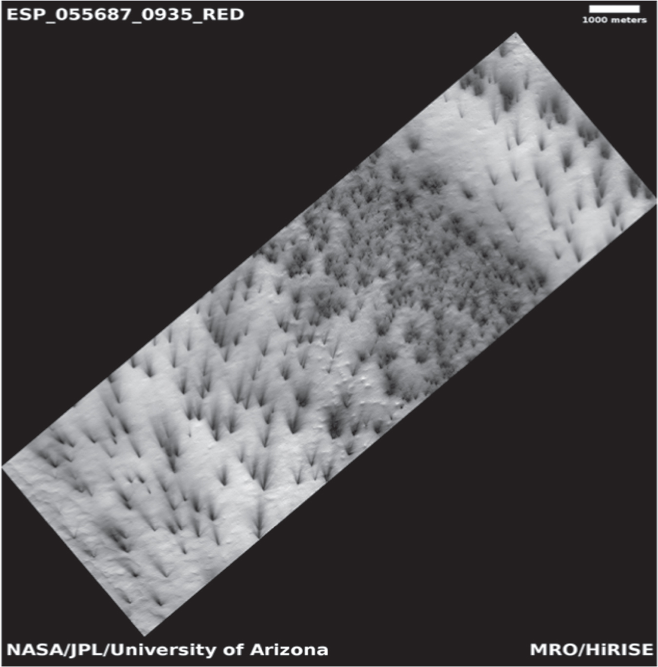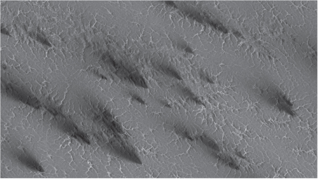 9. The entire scene, ∼1.5 km in width, is covered by a layer of translucent CO2 ice. The dark streaks in the image are fan-shaped deposits formed by cold CO2 jets, and the channels are araneiforms formed by sub-ice erosion during repeated jet outgassing over thousands of Martian years.