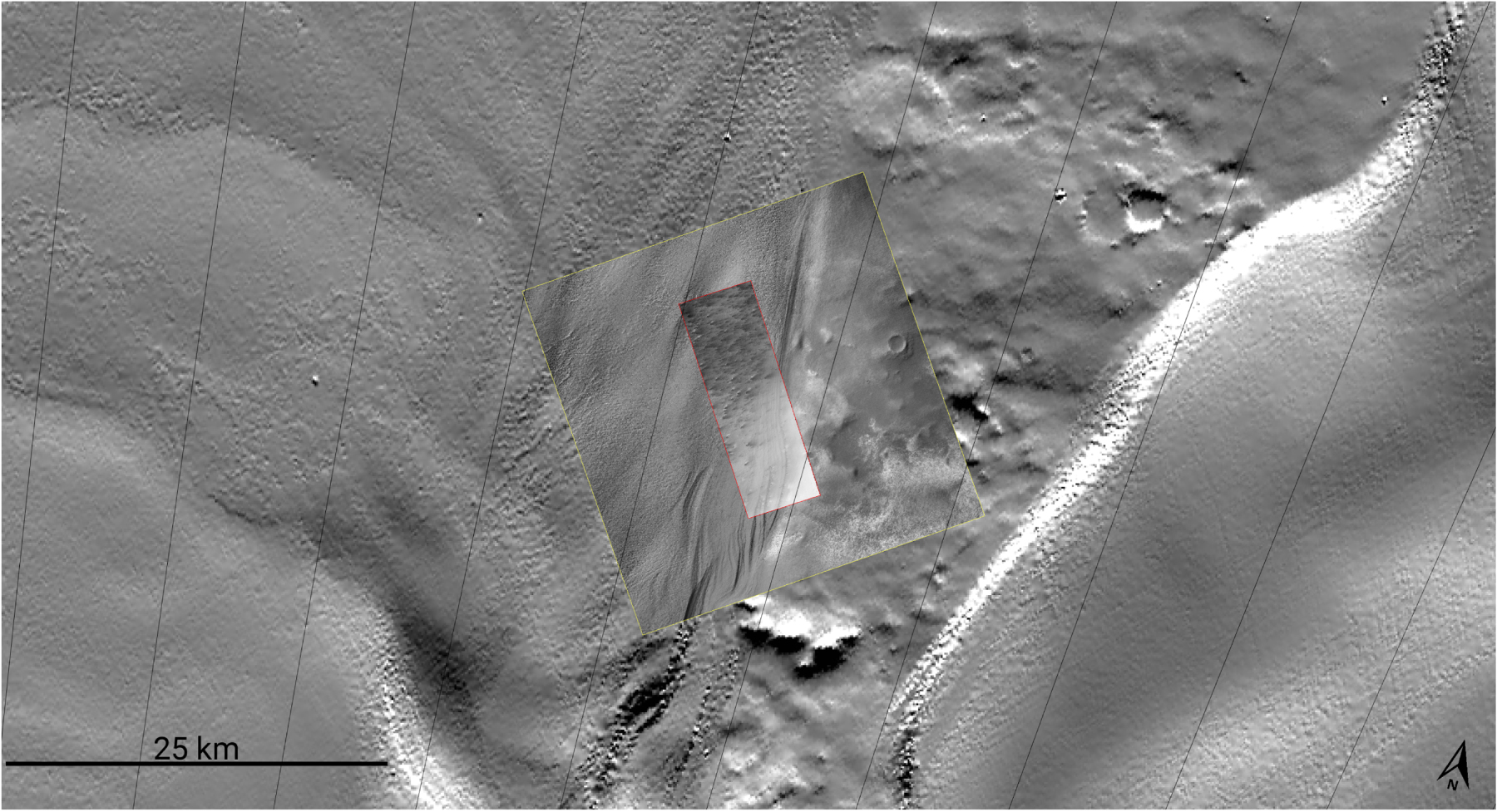 Figure 21. Context of ROI Schenectady (85.0 °S, 95.0 °E). The background image is MOLA shaded relief, the first insert is a CTX context image (G10_022114_0950_XN_85S265W), and the narrowest highest-resolution insert is HiRISE image ESP_011921_0950_RED. Meridian lines are spaced 2° apart. Direction to north is noted in the lower right corner.