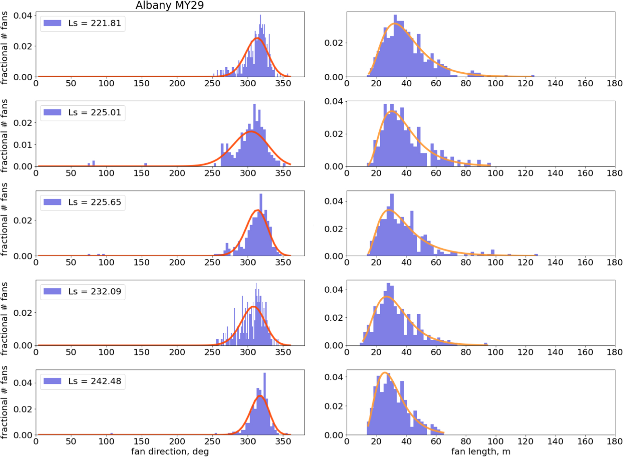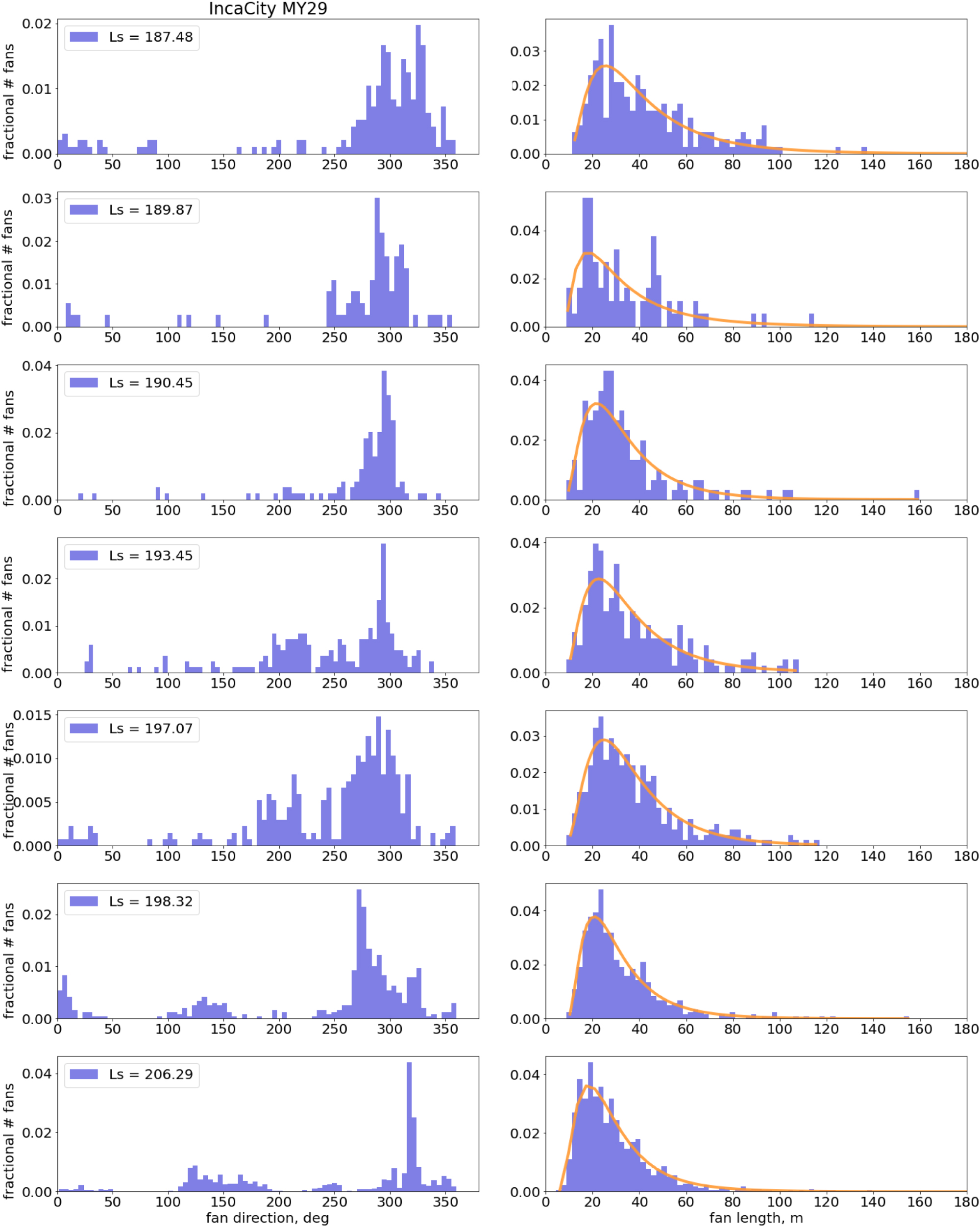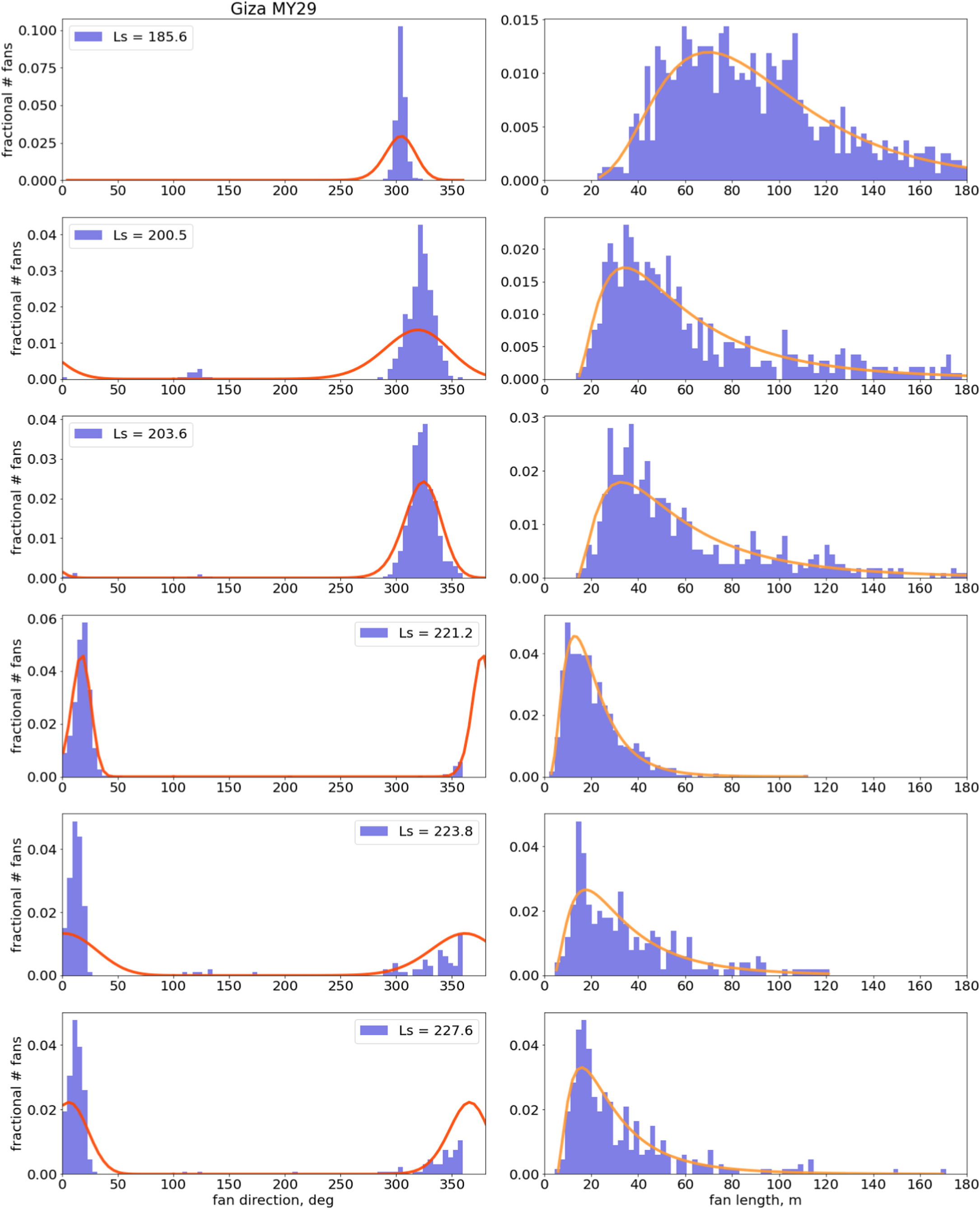 Figure 5. Histograms (blue) showing normalized distributions of P4-derived fan directions (left panels; best-fit Gaussian curves are shown) and fan lengths (right panels; best-fit Weibull function curves are shown) at ROI Giza (84.8 °S, 65.7 °E) for six HiRISE images acquired from Ls 185° to 228° (top to bottom). Y-axis shows fractional number of fans normalized in the way that the area under the histogram integrates to 1.