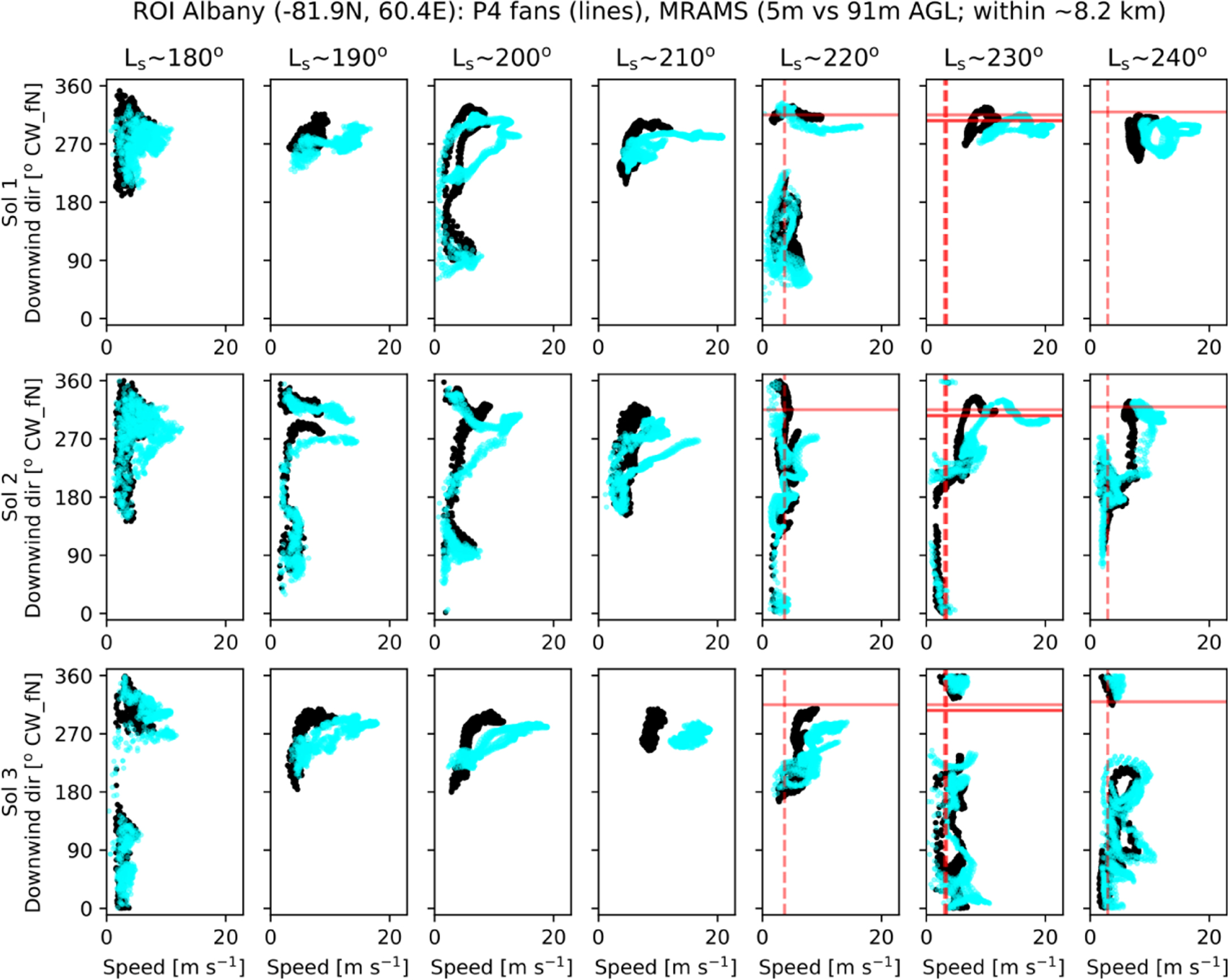 Standard image High-resolution imageFigure 17 shows a P4–MRAMS comparison for ROI Manhattan Classic. Similar plots for Manhattan Cracks and Manhattan Frontinella can be found in Appendix B. At the earliest observed Ls ≈ 180°, the fit between MRAMS and P4 5 m and 91 m AGL wind directions and speeds for Manhattan Classic is inconsistent for sol 2—only the modeled 91 m AGL winds on sol 2 exhibit a near match to the P4-inferred values. Later during the Ls ≈ 200° window, Manhattan Classic modeled winds generally match with the P4 data for wind directions, but the associated speeds poorly fit for two-thirds of the sols (the 91 m wind speeds get closest to matching). At Ls ≈ 210° and Ls ≈ 220° wind directions do not match between the model and P4 in 2 out of 3 sols (even at the 91 m level). During this period, P4 data indicate significantly higher derived wind speeds than the MRAMS model predicts at ∼5 m AGL (but the wind speeds higher above the ground match). At Ls ≈ 240° the situation changes to a good fit for wind directions and a somewhat poor fit for speeds, with P4-inferred wind speeds being on the smaller side of simulated speeds.