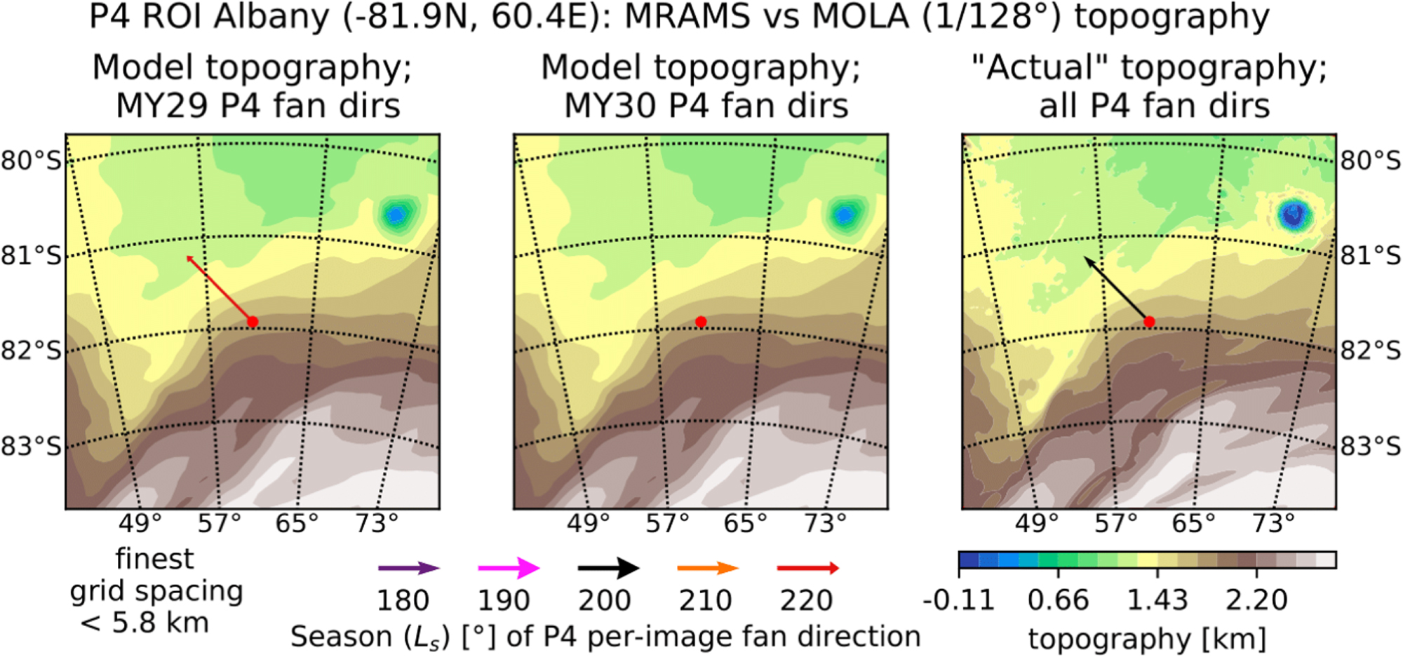 Albany (81.93 °S, 60.4 °E), Category I: Topographically, Albany is located on a relatively smooth equator-facing slope at the edge of the SLPD. P4 measured fans at this ROI starting at Ls ≈ 221°, and the resulting wind speed and direction estimates fit well to the analogous fields from MRAMS. According to MRAMS, at earlier seasons (Ls ≈ 180°–220°) the wind direction with the strongest winds (and strongest wind shear) remains quite stable, even matching well with the later-season P4-inferred wind directions. The direction of these winds is consistent with katabatic flows descending from the SPLD. Thus, MRAMS does not provide any obvious additional information about when the fans that were observed at ROI Albany by HiRISE were created.