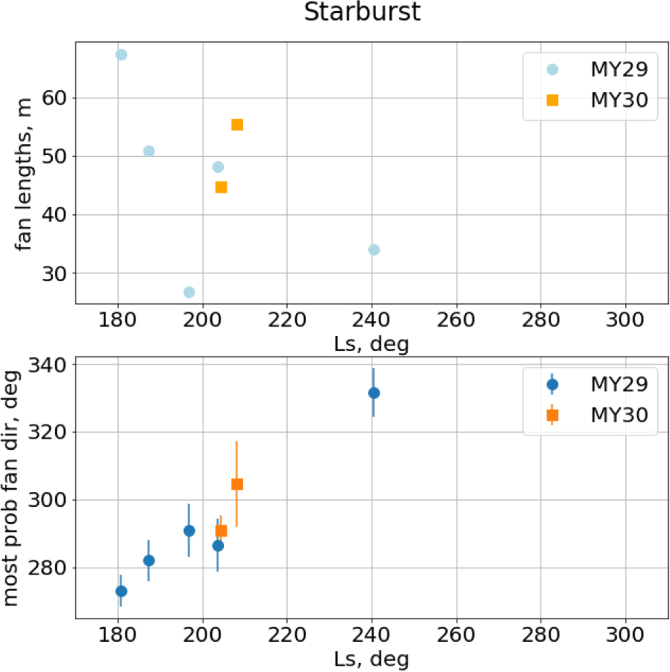 Prevailing P4-derived fan length (top panel) and directions (bottom panel) vs. Ls during local spring in ROI Starburst are compared for MY29 and MY30. To visualize the width of the fan direction histograms, we use error bars in the bottom panel. They should serve as a measure of the variability of P4 markings over a single HiRISE image, and they do not provide quality evaluation for the measurement made, i.e., they are not actual error bars. These types of plots are only included for selected ROIs that have good temporal coverage over Ls. The complete figure set (7 images) is available in the online journal. (The complete figure set (7 images) is available.)