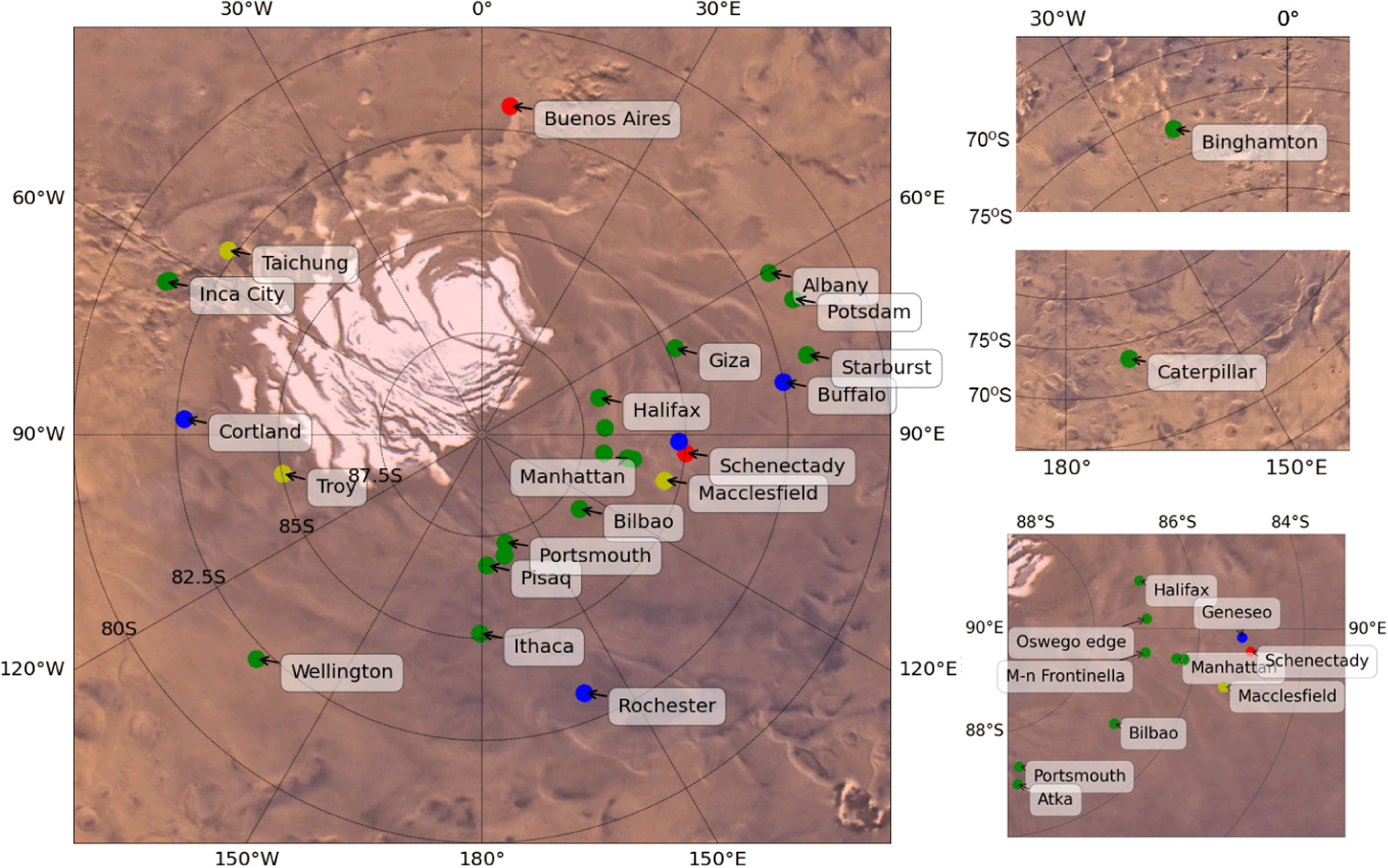Note that there are three ROIs with names that start with "Manhattan" that lie within 1° of latitude from each other: Manhattan Classic (86.4 °S, 99 °E), Manhattan Cracks (86.2 °S, 99 °E), and Manhattan Frontinella (87 °S, 99.1 °E). They all share a similar topographic setting and are Category II sites, but Manhattan Classic has P4 fan measurements for more Ls windows than the other two.