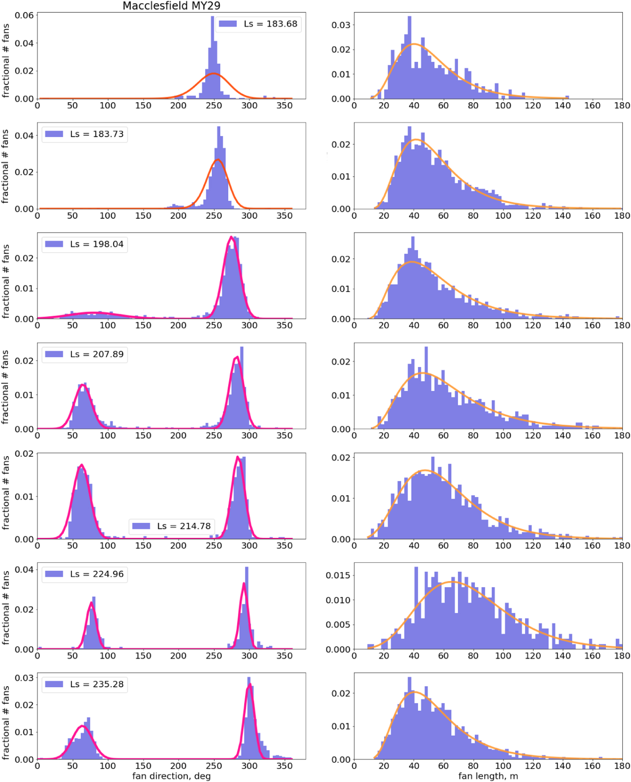 Figure 6. Distributions of P4-derived fan directions (left; best-fit Gaussian curves are shown) and lengths (right; best-fit Weibull function curves are shown) at ROI Macclesfield (data visualization similar to Figure 5). Fan direction distributions in this ROI in MY29 at Ls ≈ 198°–235° show two clear peaks (i.e., a bimodal distribution) pointing to the appearance of a second mode in the wind directions. Magenta curves represent best fits of two Gaussian curves to the wind direction histograms.