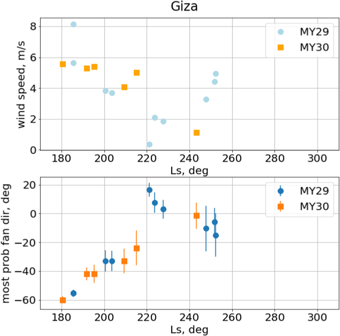 Standard image High-resolution imageFigure 7. Prevailing P4-derived wind speeds (top panel) and directions (bottom panel) vs. Ls during local spring are compared for MY29 and MY30 at ROI Giza. To visualize the width of the wind direction histograms, we use error bars in the bottom panel. They should serve as a measure of the variability of P4 markings over a single HiRISE image, and they do not provide a quality evaluation for the measurement made (i.e., they are not actual error bars).
