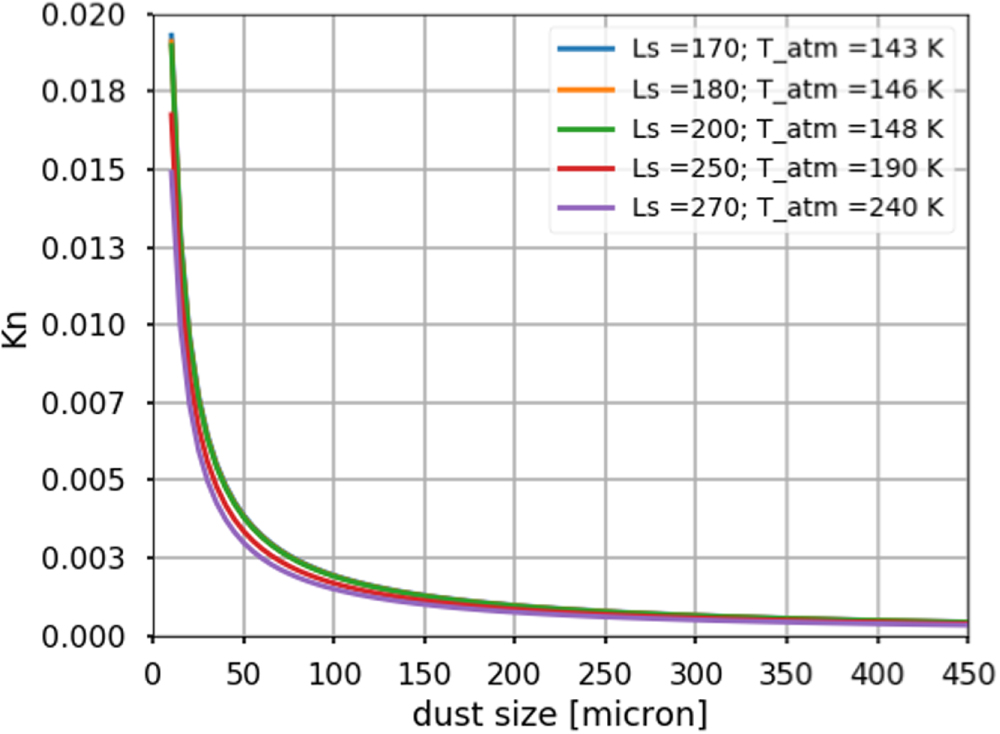 We next consider dust and sand-sized particles gravitationally setting out of the polar spring atmosphere. The particle size distribution of such a mix is discussed in Section 3.2.1. We can estimate the relevant range of Kn during the south polar cold jet eruption season by obtaining selected atmospheric state variables (temperature, pressure, air density) from the Mars Climate Database (MCD, derived from Mars global climate model output; http://www-mars.lmd.jussieu.fr/mars/access.html) for a range of Ls and P4 ROI locations.