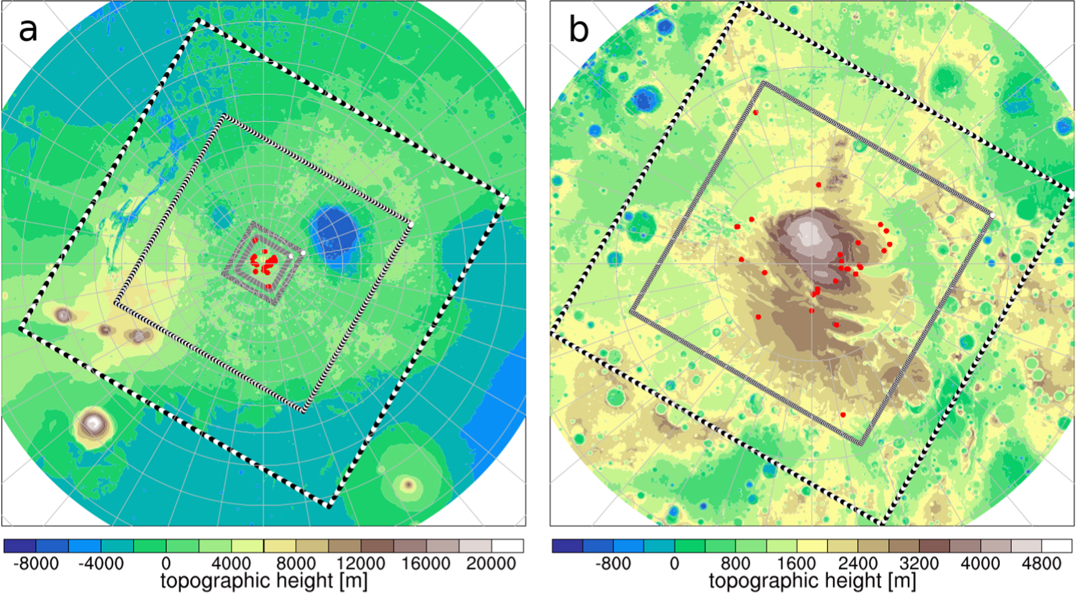 Figure 9. Geographic overview of the four MRAMS telescoping grids (square boxes) used for this work, overlaid on colorized MOLA topography. Red circles indicate P4 ROI locations, longitude = 0° is up, and latitude and longitude lines are shown every 10°. (a) The outermost (and coarsest) grid 1 is where the time-dependent GCM boundary conditions are applied, grid 2 resolves the key large-scale regional topographic features relevant to the south polar area, and grids 3 and 4 are near the center. (b) Grid 3 is an intermediate grid needed to gradually step down the model spatial resolution to the target grid spacing of < 5.8 km on grid 4 (278 × 278 horizontal points), which contains all P4 ROIs.