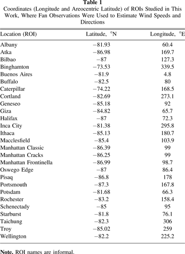 Standard image High-resolution imageTable 1. Coordinates (Longitude and Areocentric Latitude) of ROIs Studied in This Work, Where Fan Observations Were Used to Estimate Wind Speeds and Directions