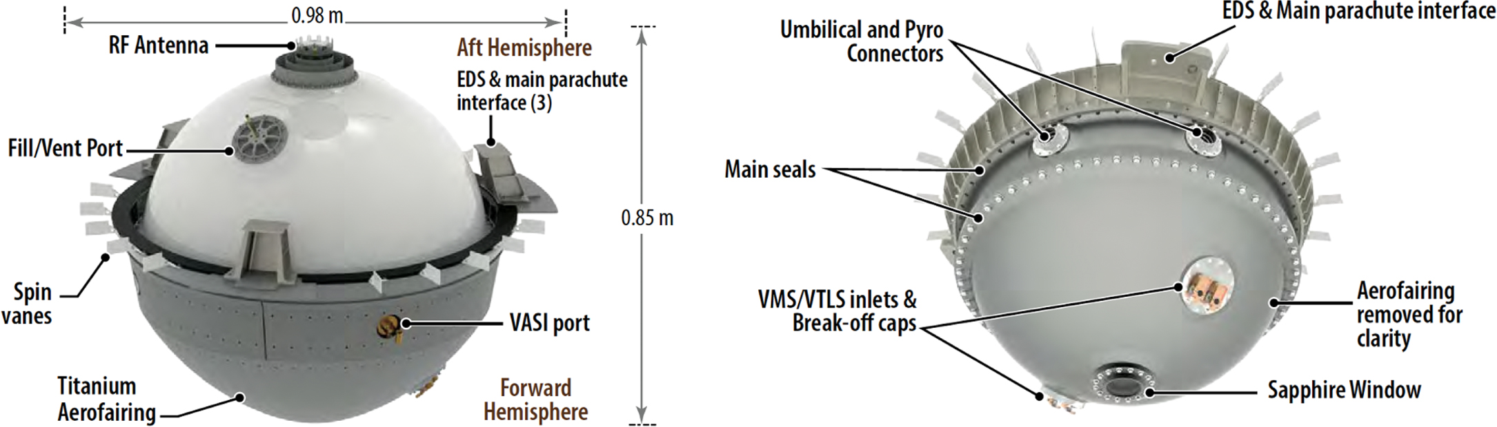 The DAVINCI DS is a hermetically sealed titanium pressure vessel with dimensions (0.98 m × 0.85 m; 200 kg) similar to the PVLP. It is notable that more recent work in DS design has reinforced the importance of maintaining and developing new probe technologies to explore the Venusian atmosphere (Lorenz 1998; Hall et al. 2000; Israelavitz & Hall 2020). Inside the DS are two payload decks, one forward and one aft relative to the descent vector. The two decks are joined together with a frustum and attached to the pressure vessel with titanium isolators around the perimeter of the forward deck. The pressure vessel itself consists of two hemispheres, forward and aft, and a mid-ring. The aerodynamic properties of the sphere are trimmed using a titanium faring joined to the forward hemisphere and mid-ring to define the outer mold line, drag plates to limit the descent velocity, and a set of spin vanes around the perimeter of the mid-ring to provide a controlled spin rate as the sphere descends through the Venusian atmosphere. The main parachute bridle attaches to points on the mid-ring. Figure 10 illustrates the outer DS components.