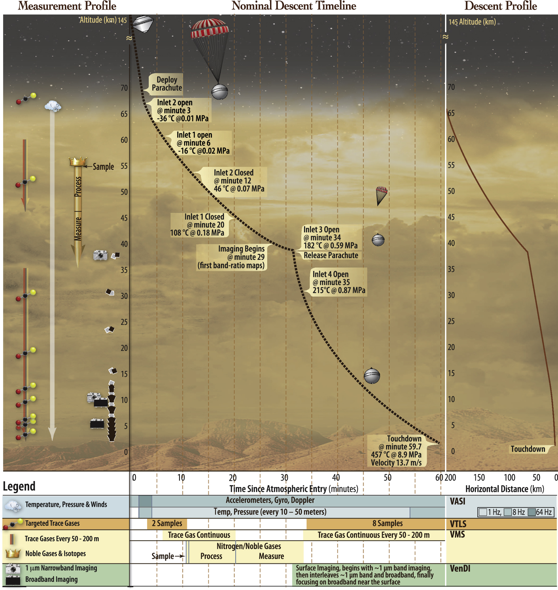 Figure 5. Summary of descent sphere vertical descent timeline in the Venusian atmosphere with select science topics pursued at each altitude band.